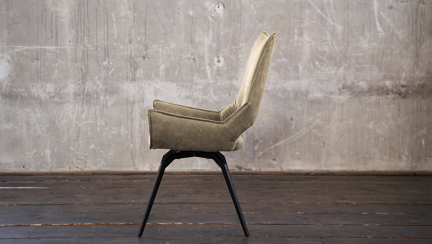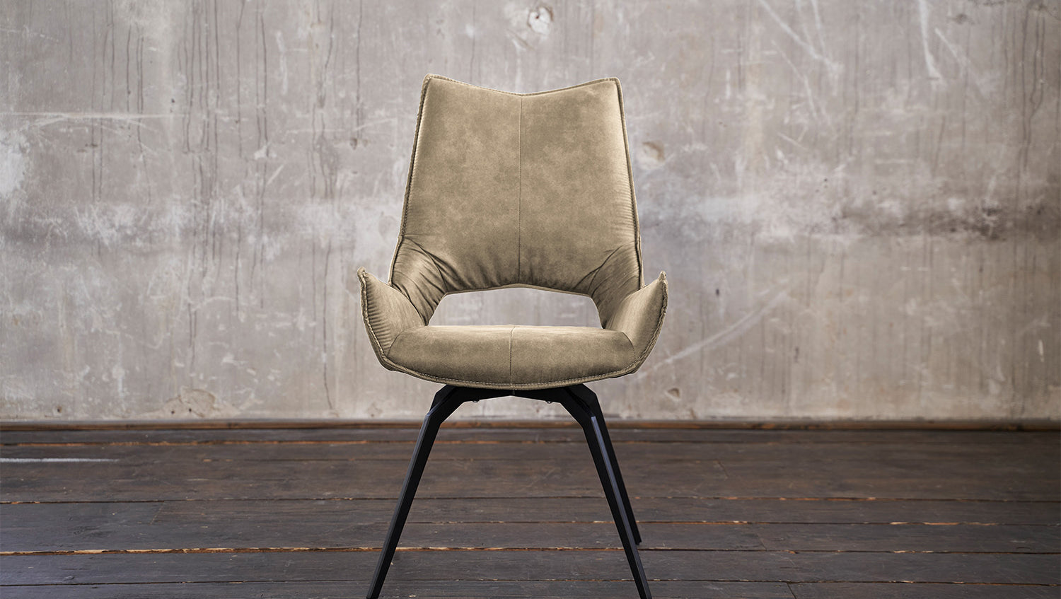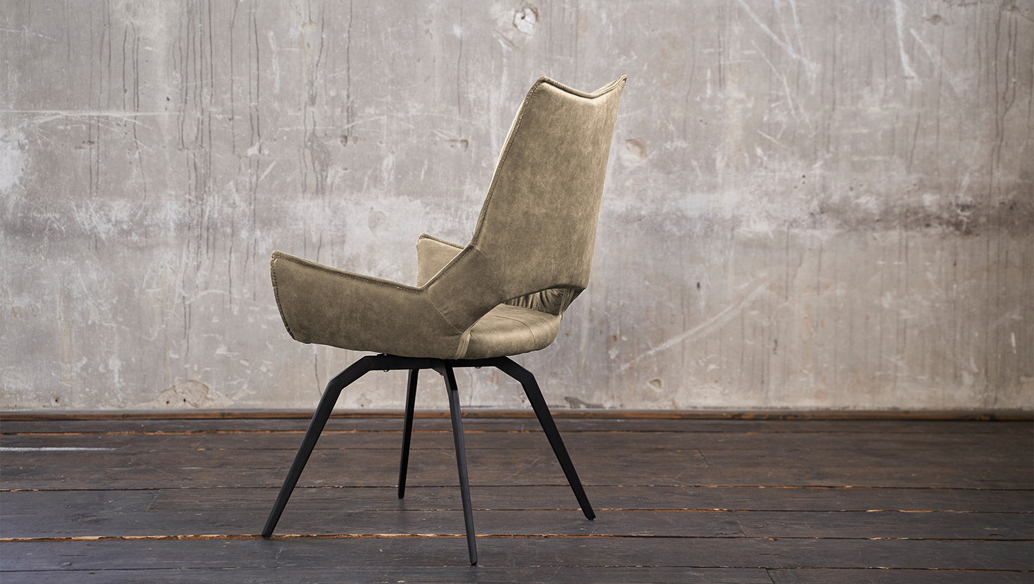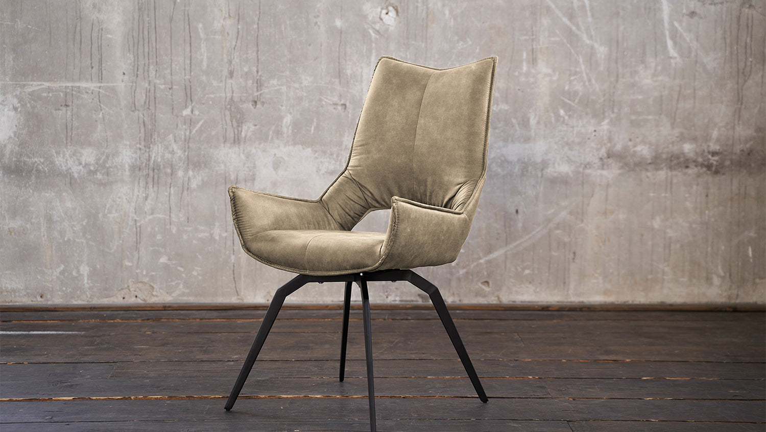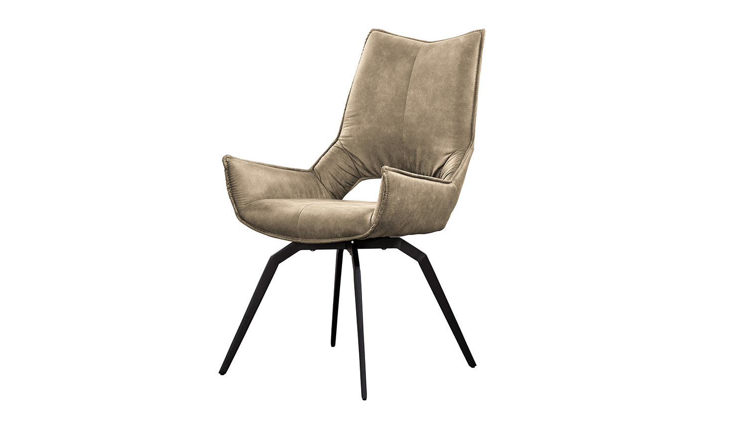 La silla de comedor SIVO llama inmediatamente la atención por su interesante forma. Tanto la carcasa del asiento, cómodamente acolchada, como las patas giratorias en ángulo tienen un diseño inusual. En la carcasa del asiento, que por lo demás es continua, hay un hueco en la parte inferior del respaldo que completa su aspecto especial. La funda de tela de la silla giratoria es fácil de cuidar y muy agradable al tacto. La silla tapizada es ideal para el comedor o la zona de trabajo en casa, como silla en la sala de espera o como silla de reuniones en la oficina.