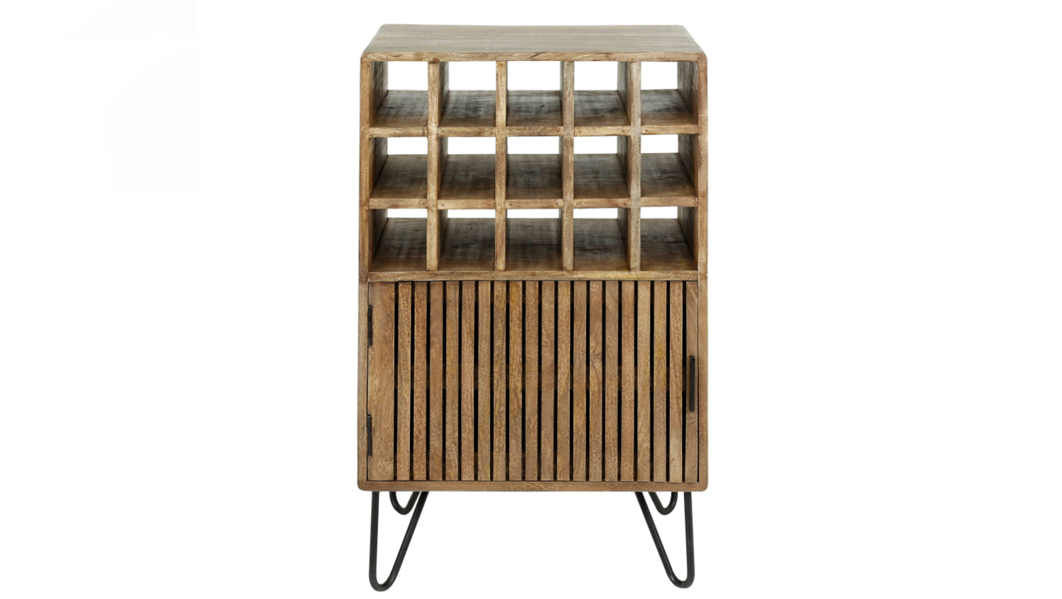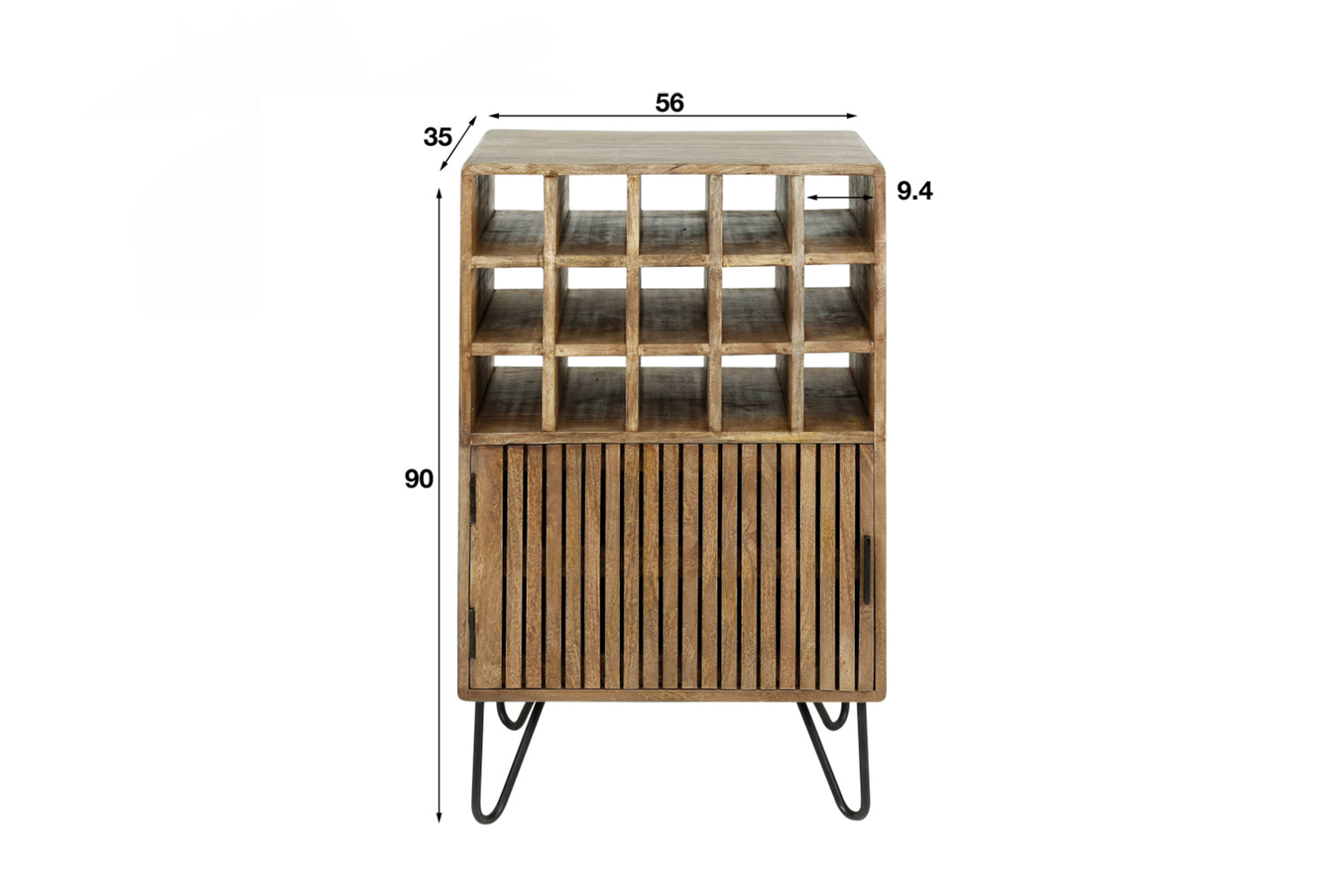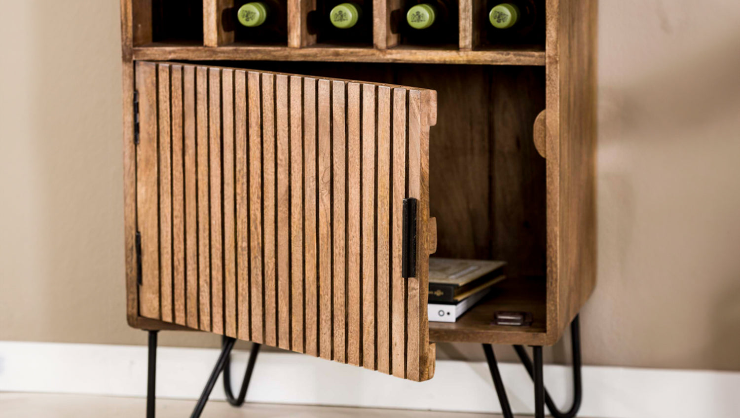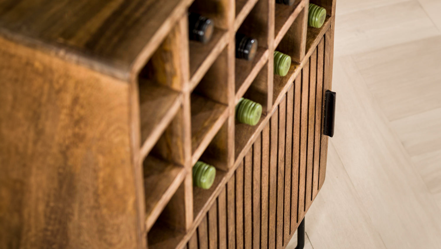El armario para vinos KAWOLA HORTA combina el diseño tradicional con el encanto moderno. Fabricado en madera maciza de mango y lacado en un sofisticado color arena, irradia elegancia natural. Los peldaños de la puerta le confieren un aspecto atemporal que se integra armoniosamente en diversos estilos de interior. Con 15 compartimentos para vino, el armario ofrece mucho espacio para guardar sus vinos favoritos con estilo. Las copas y los accesorios también pueden guardarse cómodamente detrás de la puerta. El robusto acabado garantiza estabilidad y durabilidad. Ya sea en el comedor, en el salón o en el bar de casa, el armario para vino HORTA es un verdadero punto culminante para los amantes del vino que aprecian la funcionalidad y el diseño.