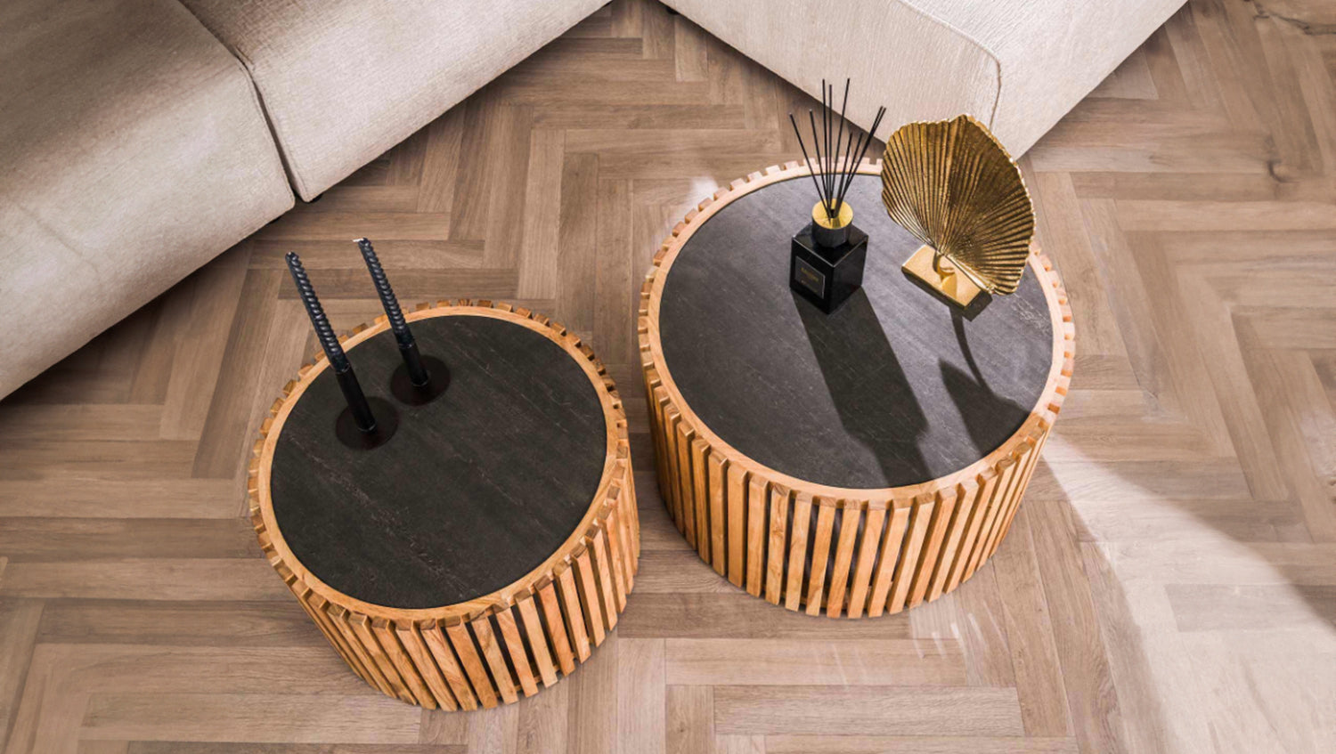 El juego de mesa de centro redonda PINE de KAWOLA combina un diseño atemporal con materiales naturales y es el complemento perfecto para cualquier salón. Compuesto por dos mesas armoniosamente coordinadas, el conjunto impresiona por su elegancia y funcionalidad. Los tableros de las mesas están hechos de una fina capa de pizarra, que no sólo les da un aspecto elegante, sino que también reduce su peso. Los tableros se apoyan en robustos bastidores de madera maciza de acacia, para mayor estabilidad y encanto natural. La mesa más grande tiene un diámetro de 68 cm y una altura de 40 cm, mientras que la más pequeña tiene un diámetro de 55 cm y una altura de 35 cm. Ya sea moderno, rústico o clásico, el conjunto de mesa de centro PINE se adapta sin esfuerzo a cualquier estilo de decoración gracias a su aspecto atemporal. Ideal como centro de mesa con estilo en el salón y una auténtica atracción para los amantes de los muebles de alta calidad.