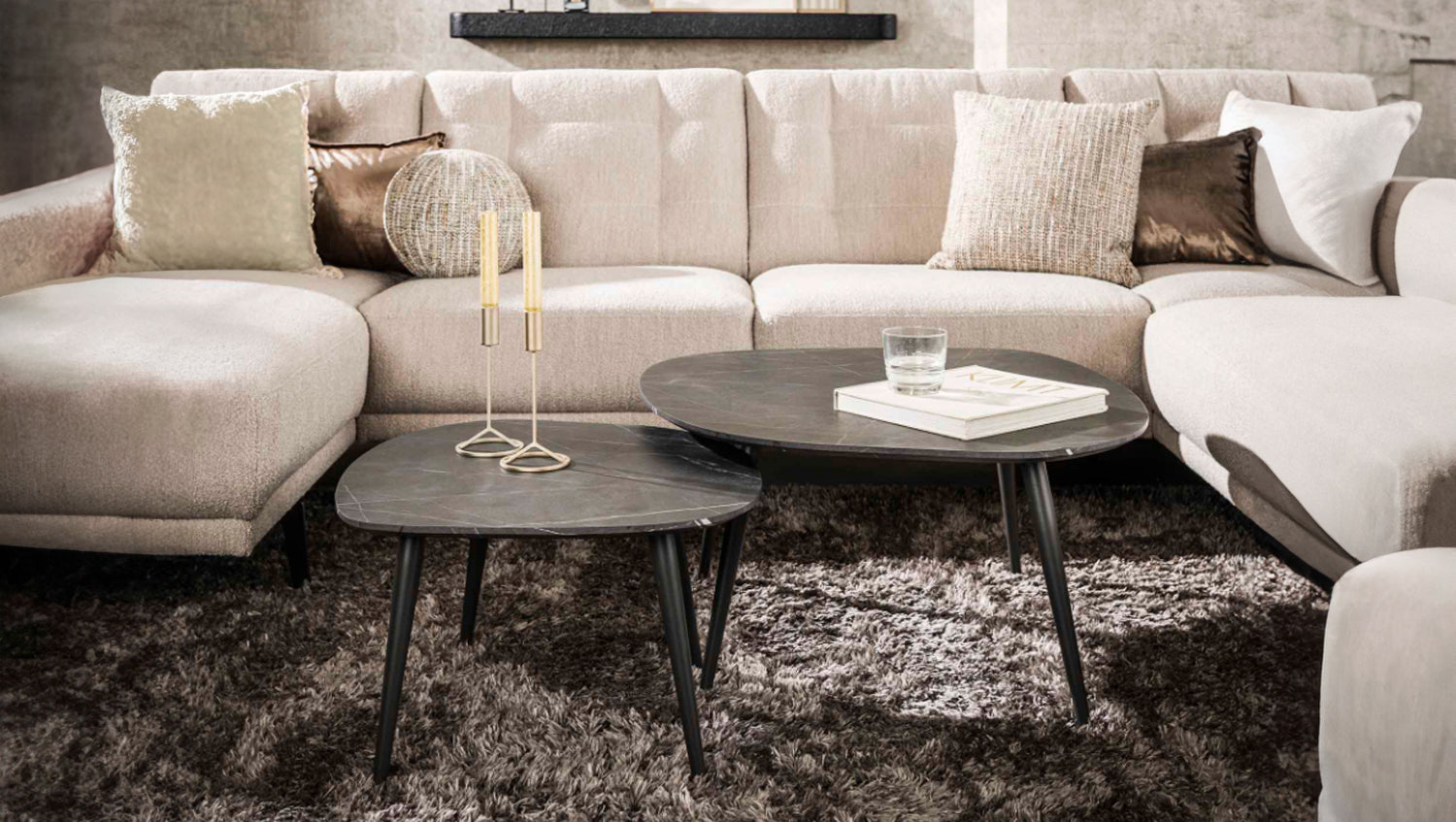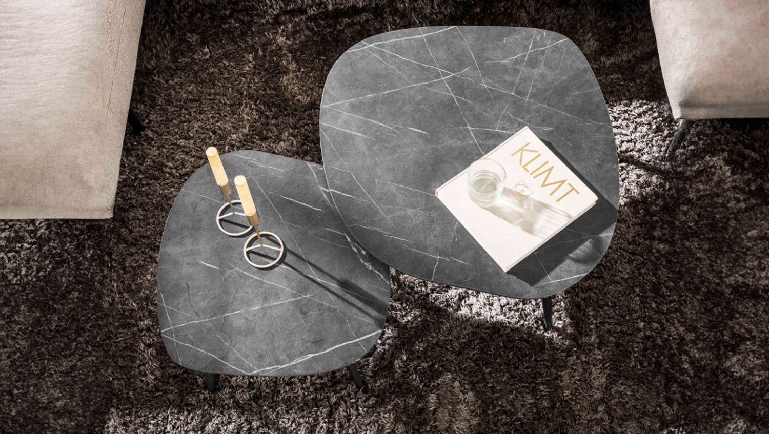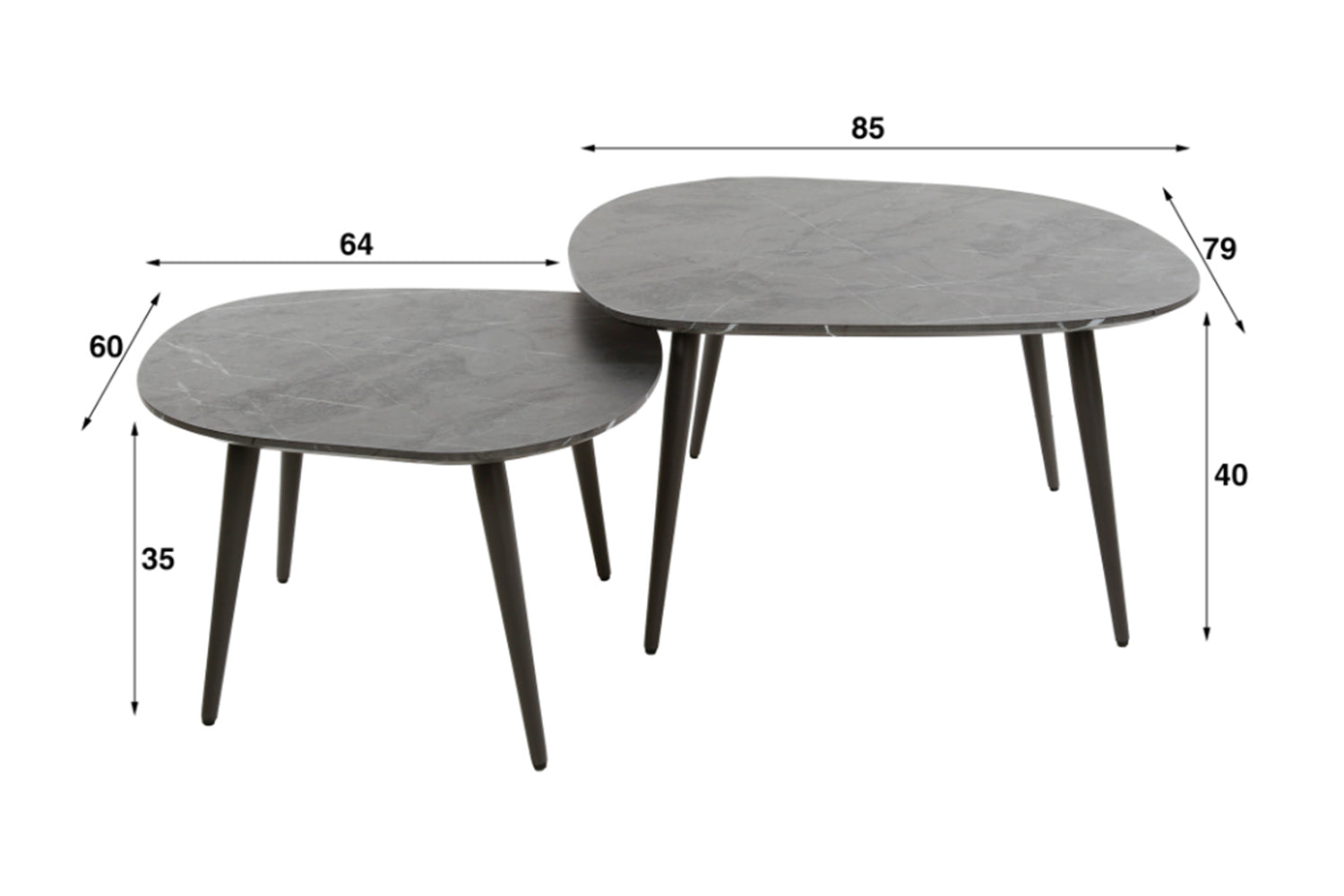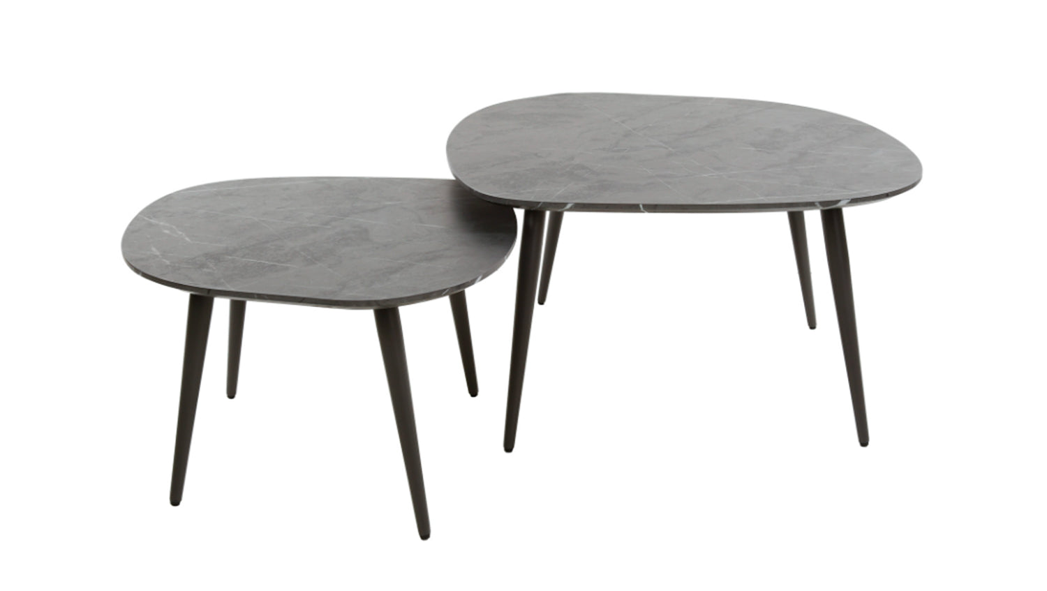 El juego de mesa de centro orgánica PARANA de KAWOLA está fabricado en melamina con aspecto de cerámica y estructura de acero. La mesa es casi indistinguible de una mesa de cerámica. El tablero de la mesa, hecho a mano, consiste en una capa de resina de melamina que se aplica sobre madera. El material se aplica mediante calor y presión. La belleza del material en combinación con la forma de pera da como resultado una mesa moderna pero atemporal. El juego consta de dos mesas. La mesa más grande tiene una superficie de 85 x 79 cm y una altura de 40 cm, mientras que la mesa más pequeña tiene una superficie de 64 x 60 cm y una altura de 35 cm. Ya sea en un moderno loft, en un acogedor salón o en una elegante sala de estar, el juego de mesa de centro PARANA pone acentos de estilo y combina funcionalidad con una estética atemporal.