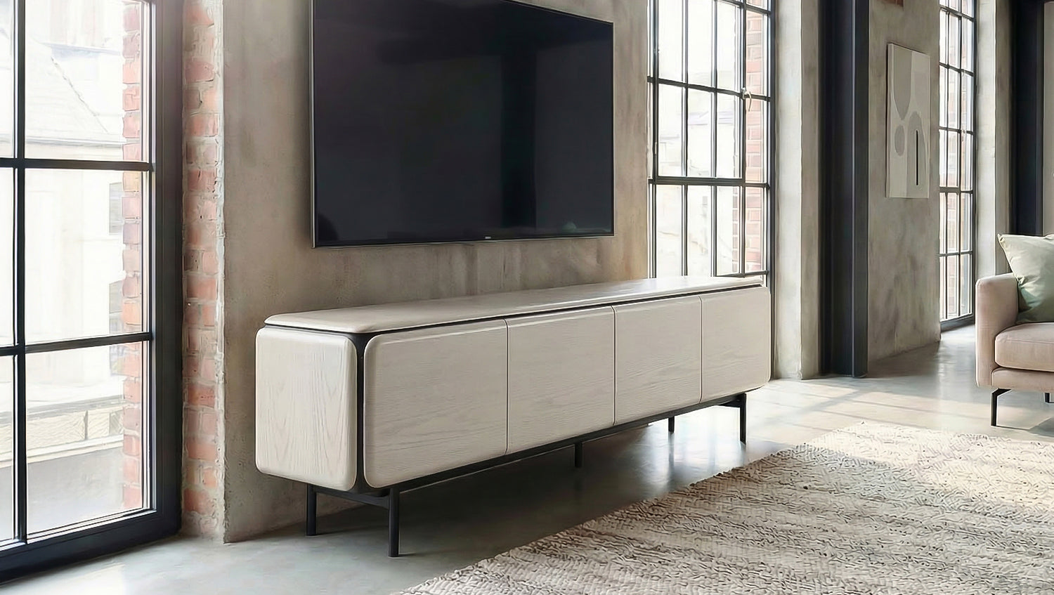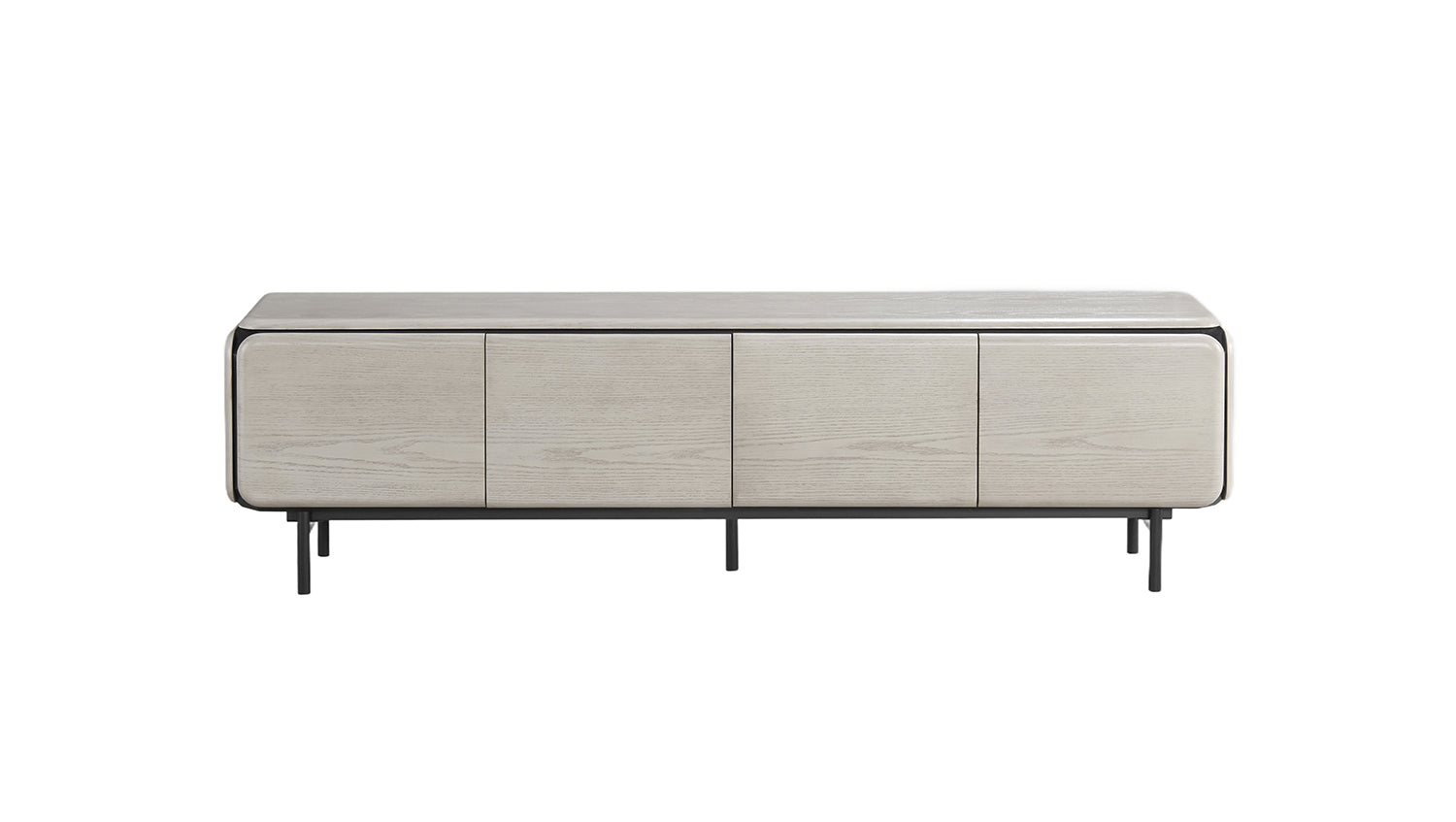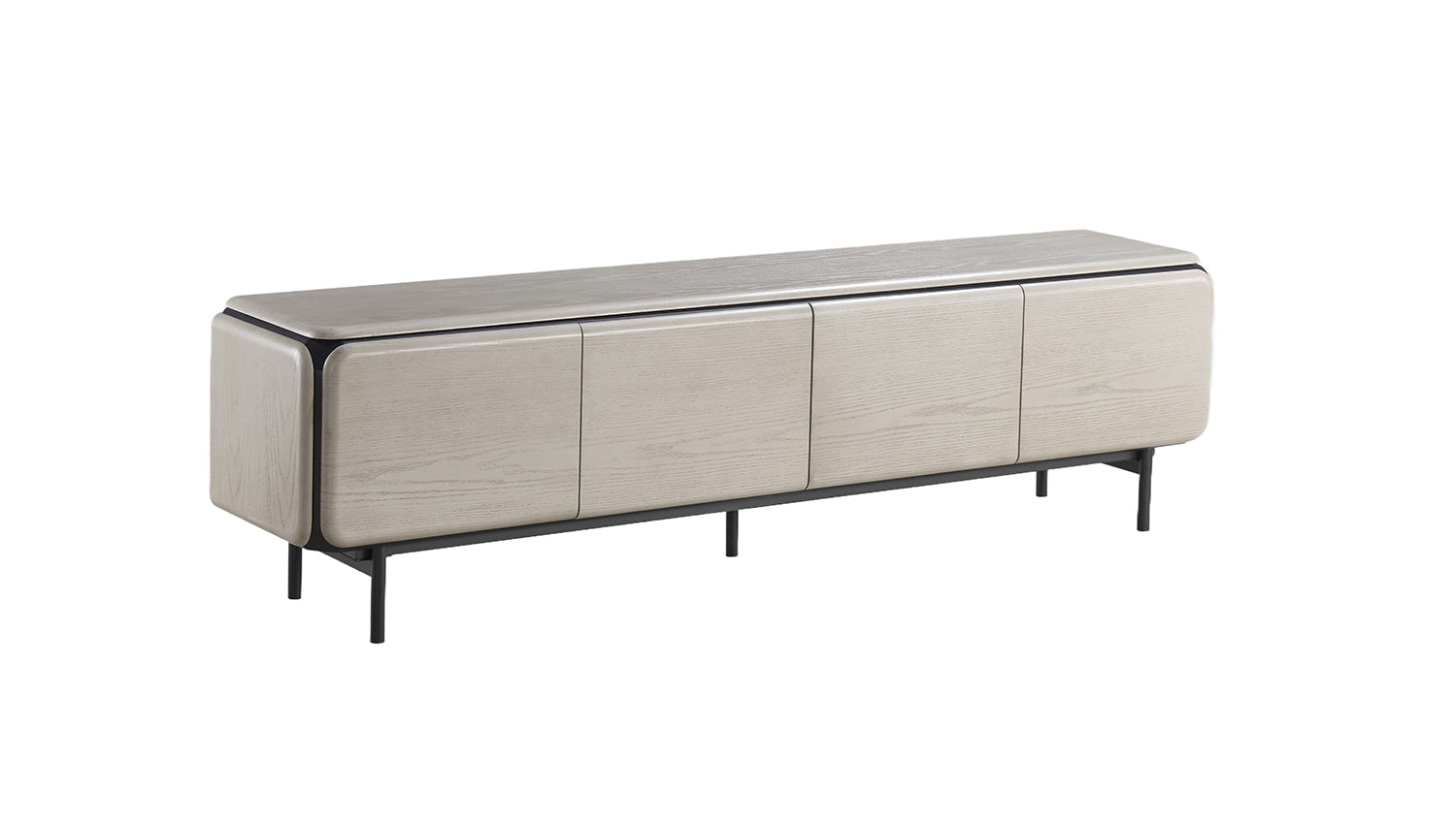 • Mueble bajo moderno con frente limpio sin tiradores y laterales redondeados.
