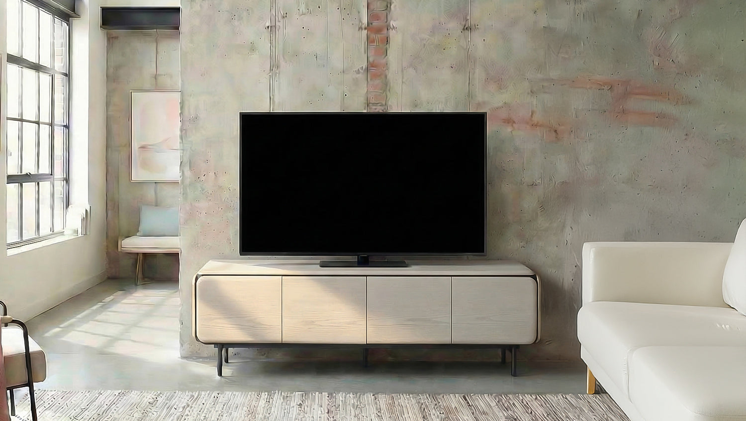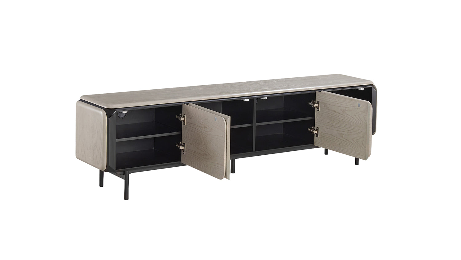 El mueble bajo AVRIL de KAWOLA combina un diseño moderno con una sofisticación funcional y se convierte en el elegante centro de atención de su salón. El frente claramente estructurado con cuatro puertas sin tiradores transmite tranquilidad y elegancia, mientras que los laterales suavemente redondeados confieren al mueble una ligereza especial. El cuerpo y las puertas están fabricados en MDF y revestidos con chapa de roble de alta calidad, lo que le confiere un aspecto natural y elegante. La delicada estructura metálica con recubrimiento en polvo negro subraya su carácter contemporáneo y, al mismo tiempo, garantiza su estabilidad. Detrás de las cuatro puertas se esconden un total de ocho amplios compartimentos que ofrecen mucho espacio para guardar receptores, consolas de videojuegos, accesorios o complementos para el hogar. Gracias al mecanismo «push-to-open», las puertas se abren cómodamente con una ligera presión, mientras que las bisagras de cierre suave permiten un cierre suave y silencioso. Así, el aparador para TV AVRIL combina una tecnología bien pensada con un acabado de alta calidad y una estética atemporal, ideal para un salón decorado con estilo.