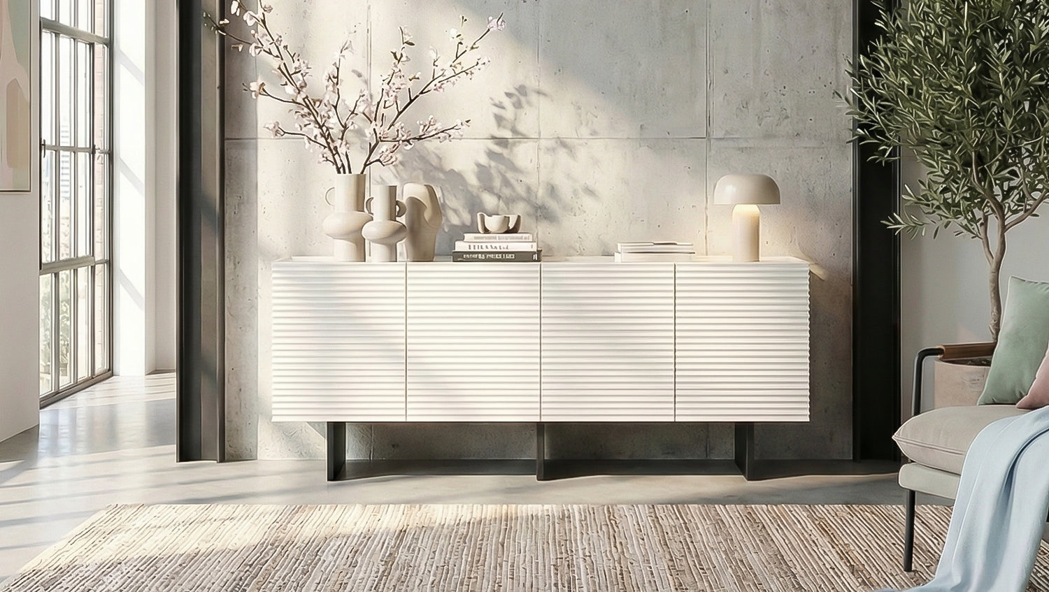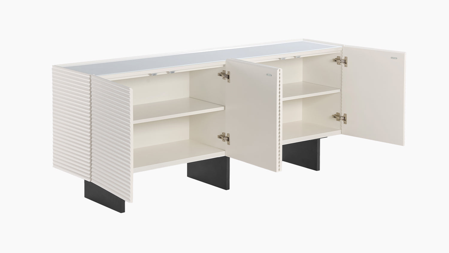 Detrás de cuatro puertas, LYNN ofrece un amplio espacio de almacenamiento con un total de cuatro compartimentos. Los estantes se pueden colocar de forma flexible en tres alturas diferentes, cada una con una separación de 7 cm, para que pueda adaptar el espacio interior a sus necesidades individuales. El mecanismo integrado de tirador de dedo permite una apertura cómoda, mientras que las bisagras de cierre suave garantizan un cierre suave y silencioso. De este modo, el aparador combina un aspecto extraordinario con una funcionalidad bien pensada.