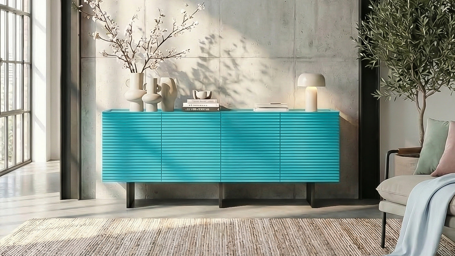 El aparador LYNN de KAWOLA combina un diseño moderno con una estructura frontal llamativa y líneas limpias. Su superficie de acabado refinado le confiere al mueble una profundidad especial y lo convierte en un elegante elemento decorativo en el salón o el comedor. El cuerpo de madera se complementa con una elegante encimera de cristal, que aporta al diseño un toque contemporáneo y de alta calidad. La estructura metálica con recubrimiento en polvo garantiza la estabilidad y subraya el carácter purista del Aparador.