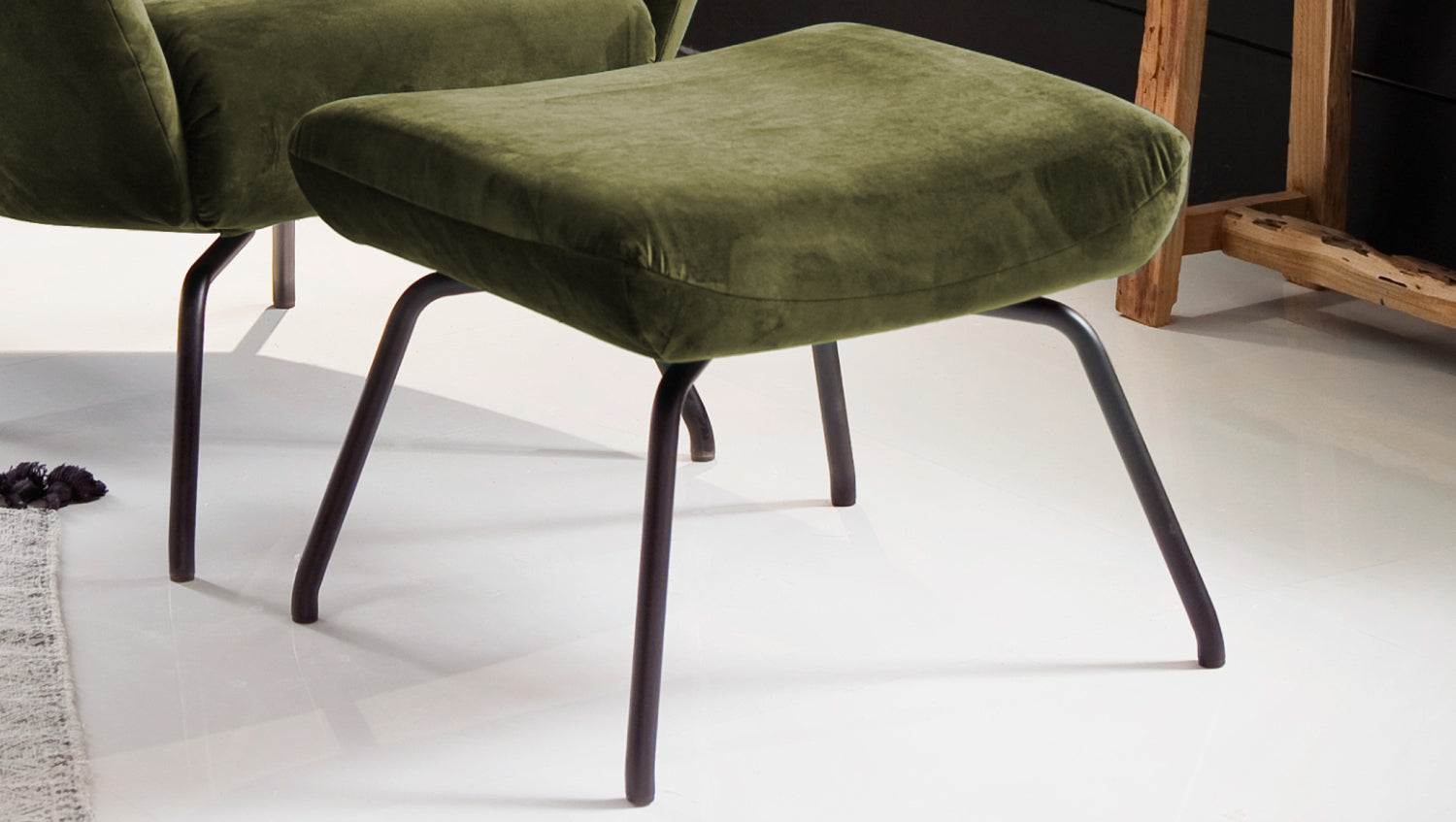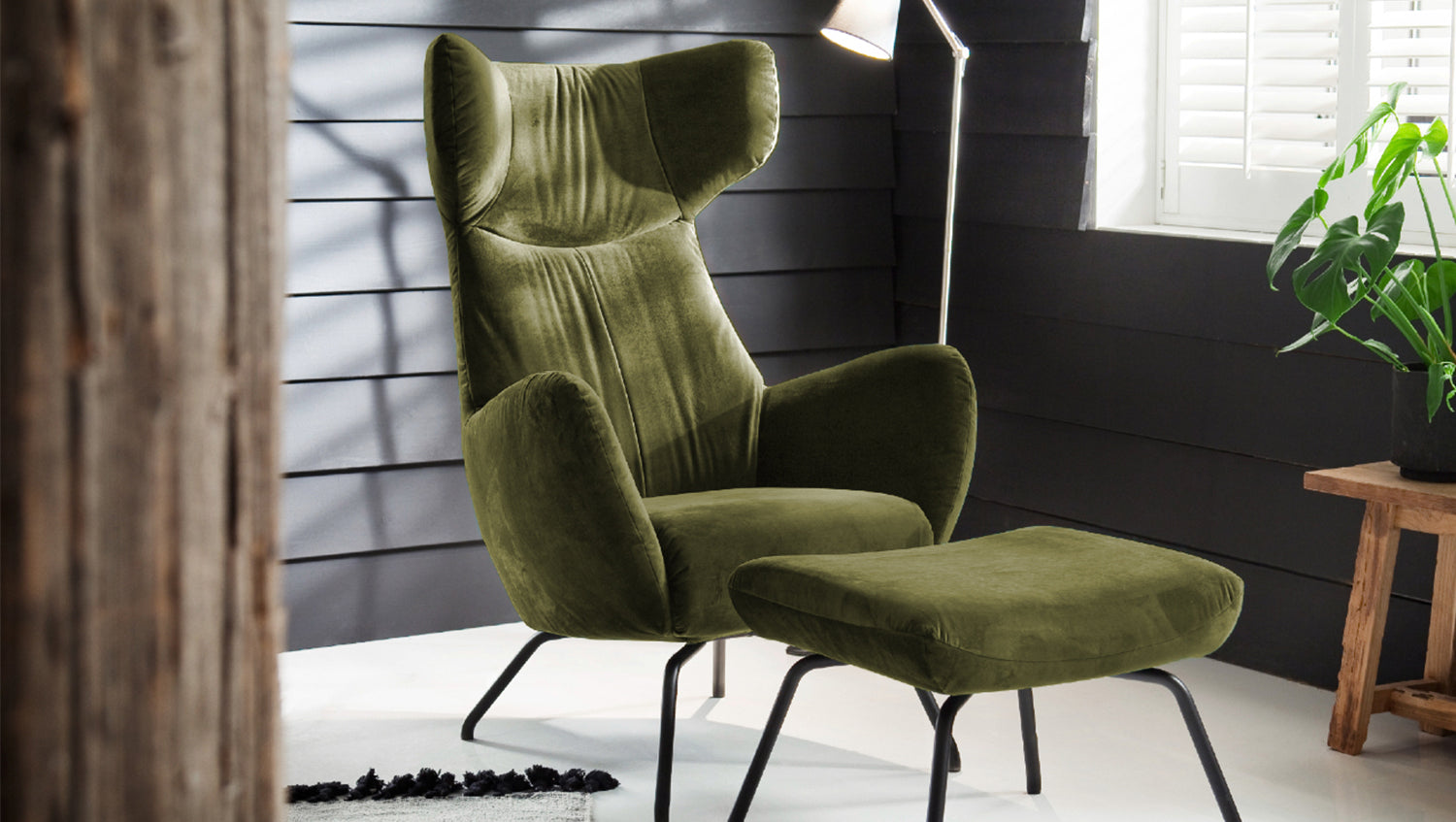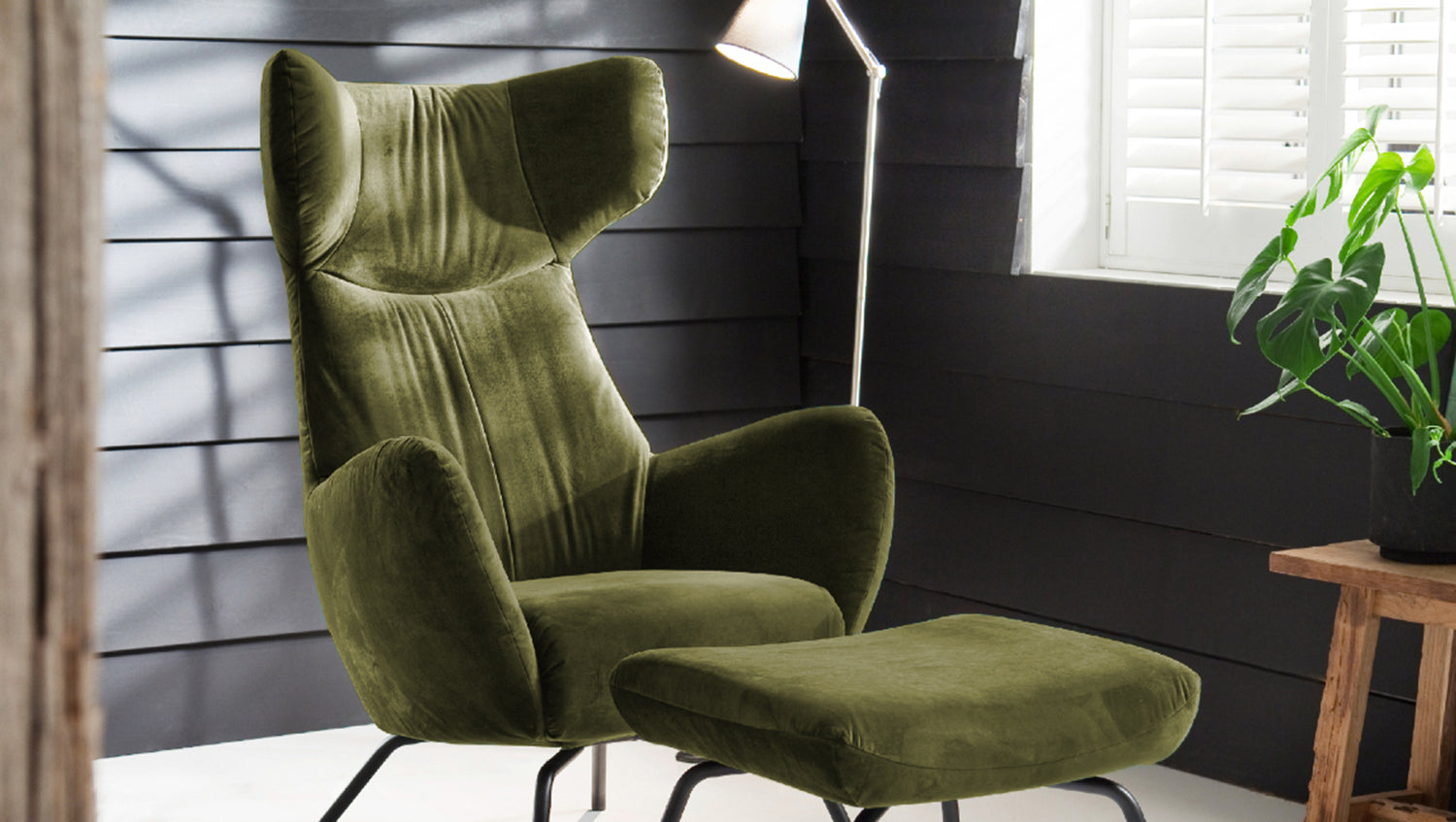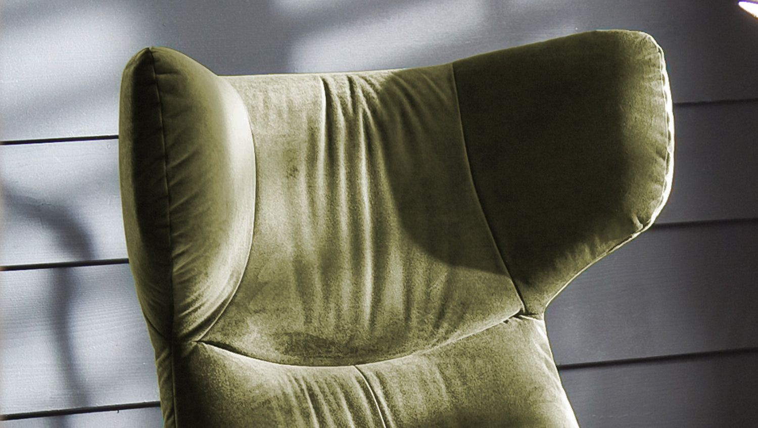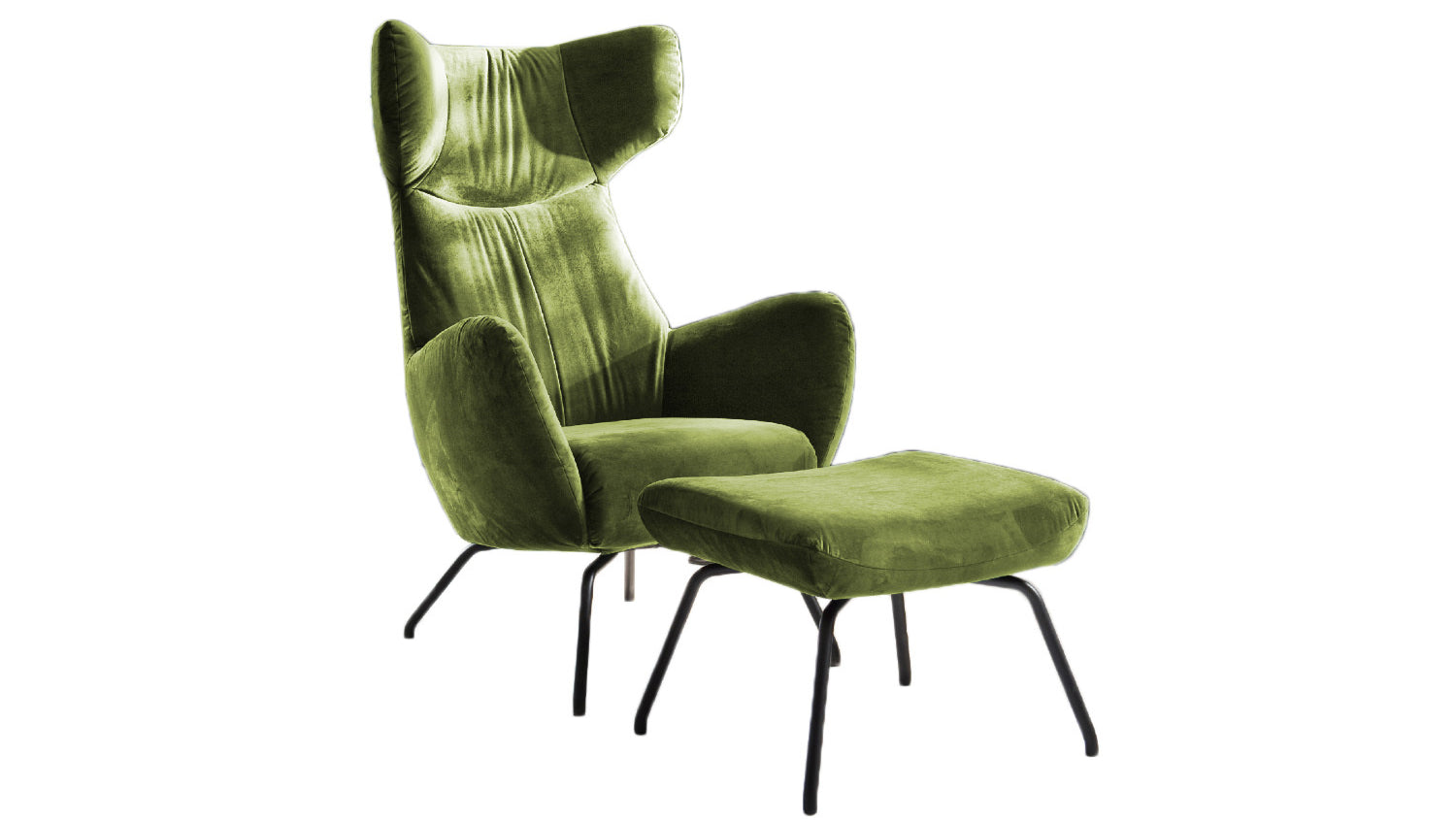 KAWOLA sillón LOTTE wing chair terciopelo verde oliva con Puf