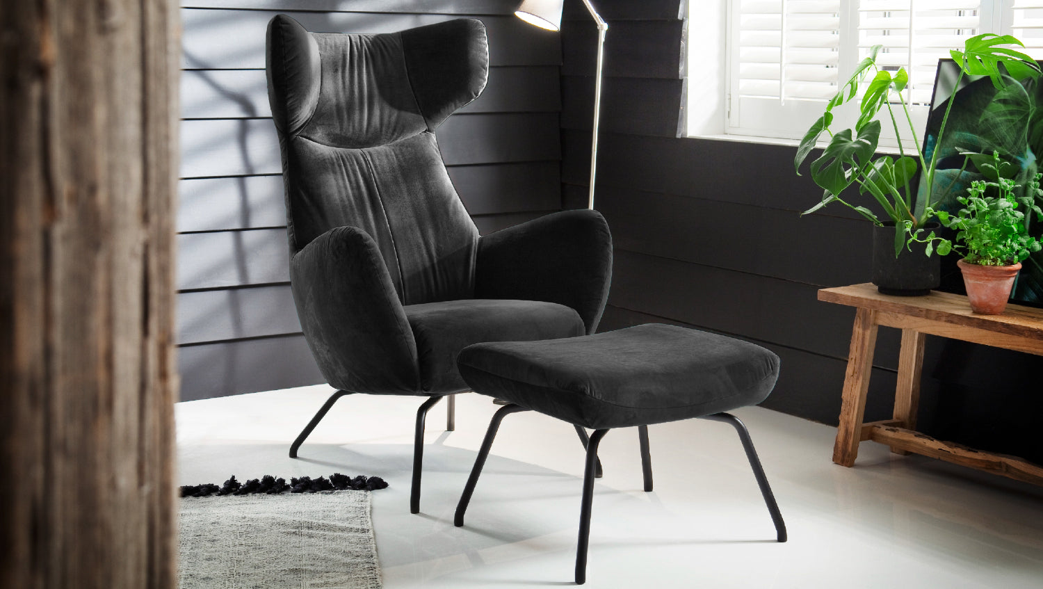 KAWOLA sillón LOTTE sillón LOTTE terciopelo negro con Puf