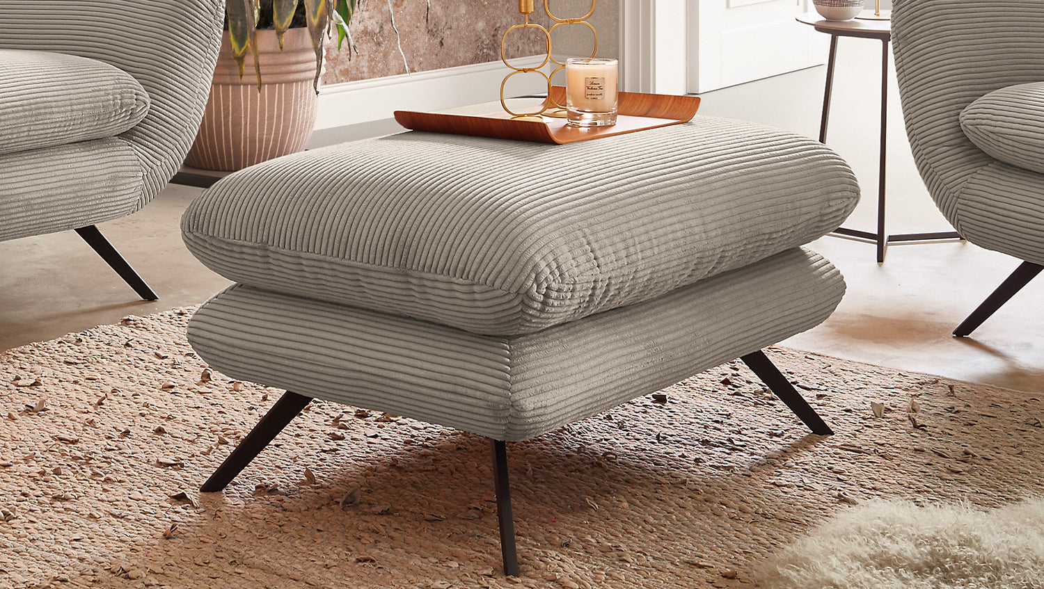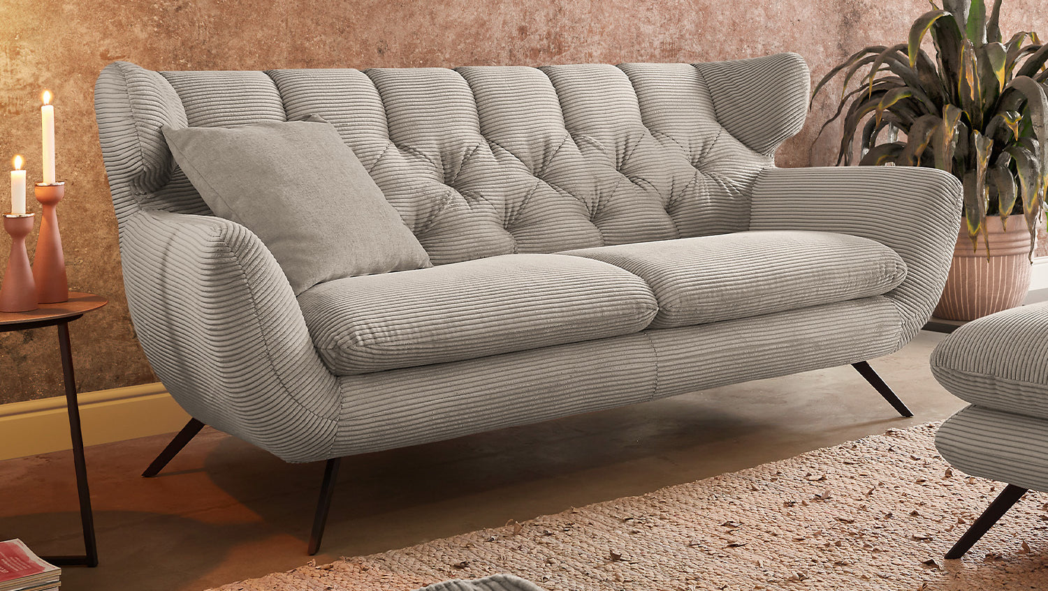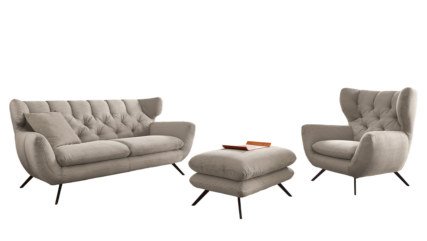 El grupo de asientos KAWOLA CHARME, compuesto por un sofá, un sillón y un Puf, está completamente revestido de pana. El respaldo también es de pana, lo que permite colocar el sofá y el sillón en cualquier lugar de la habitación. El estilo recuerda a los años sesenta: los respaldos del sofá y el sillón se han acolchado de forma elaborada sin botones; los respaldos se han curvado ligeramente hacia delante en ambos lados y recuerdan la forma de un sillón de ala; los pies de metal negro son ligeramente acampanados. La tapicería de la colección KAWOLA CHARME es de espuma PUR e impresiona por su comodidad de asiento suave y desenfadada. Los cojines del asiento se amoldan cómodamente a la forma del cuerpo. Si lo que busca no es simplemente un lugar donde sentarse, sino un punto de atracción muy especial, el grupo de asientos CHARME es la elección perfecta.