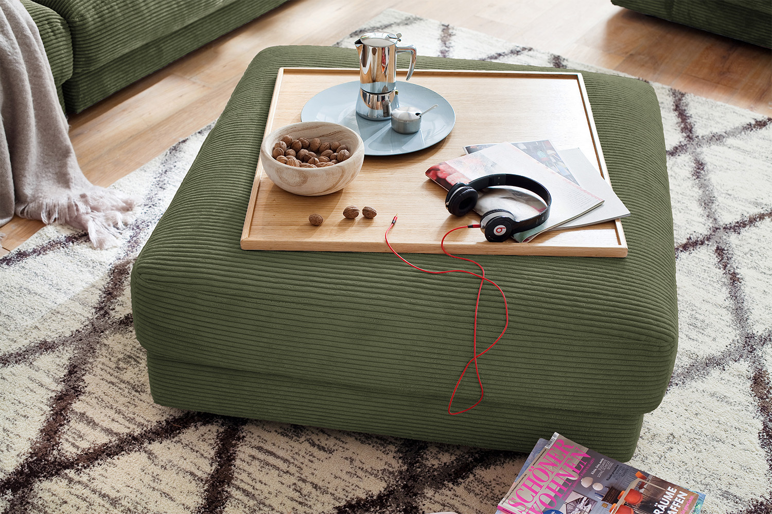 Produktinformationen "KAWOLA Big Hocker MADELINE Polsterhocker Cord olivgrün"