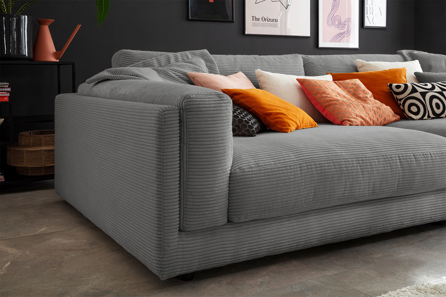 Genießen Sie den mittelfesten Sitzkomfort, der perfekt für entspannte Abende zu dritt ist. Mit einer beeindruckenden Breite von 294 cm und einer großzügigen Sitztiefe von 104 cm bietet das RAINA genügend Platz für alle. Dank des geringen Pillingrisikos behält der Cordbezug sein makelloses Aussehen über lange Zeit.
