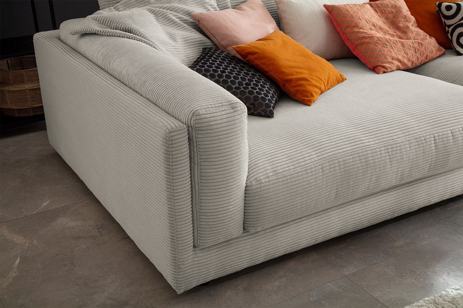 Genießen Sie den mittelfesten Sitzkomfort, der perfekt für entspannte Abende zu dritt ist. Mit einer beeindruckenden Breite von 294 cm und einer großzügigen Sitztiefe von 104 cm bietet das RAINA genügend Platz für alle. Dank des geringen Pillingrisikos behält der Cordbezug sein makelloses Aussehen über lange Zeit.