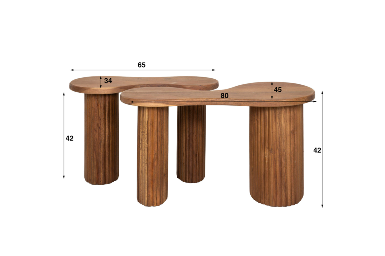 Das schöne Couchtisch-Set MALIKA von KAWOLA ist aus Akazienholz gefertigt und hat ein modernes Design mit einer Wellenform - ein echter Blickfang! Die Tische können nach Belieben zusammen gestellt werden. Das Set besteht aus zwei Tischen. Der größte Tisch hat eine Fläche von 80 x 45 cm, der kleinere Tisch hat eine Fläche von 65 x 34 cm und eine Höhe von 41 cm. Beide Tische haben eine Höhe von 42 cm. Ob im modernen Loft, im gemütlichen Wohnzimmer oder in einer eleganten Lounge – das Couchtisch-Set MALIKA setzt stilvolle Akzente und verbindet Funktionalität mit zeitloser Ästhetik.Produktdetails