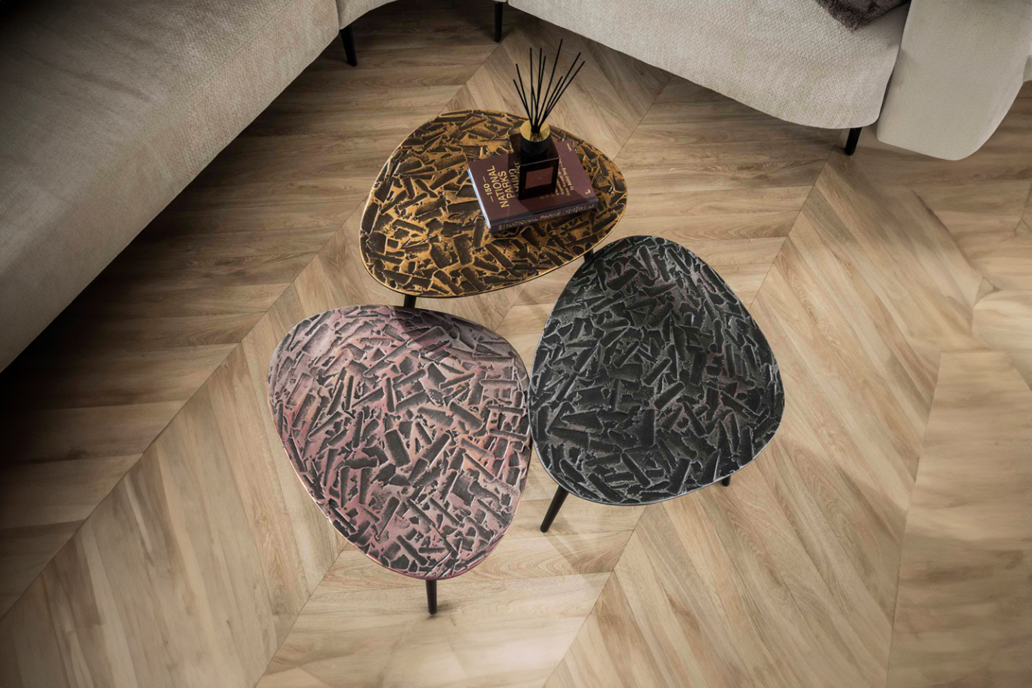 Das trendige Couchtisch-Set YATA von KAWOLA in Dreiecksform ist aus platinfarbenem Metall gefertigt. Die Platte ist wunderschön gearbeitet und verleiht ihm einen einzigartigen Look. Dieses Set kombiniert Silber und Gold. Die Tische können nach Belieben spielerisch zusammen gestellt werden. Dieses Set kombiniert Silber, Kupfer und Gold. Es besteht aus drei Tischen, die sich nach Belieben spielerisch zusammenstellen lassen. Das Set ist ein echter Blickfang! Die Tische haben eine Fläche von je 60 x 48 cm, bei unterschiedlichen Höhen von 43 cm, 39 cm und 36 cm. Der mittlere Tisch hat eine Fläche von 80 x 60 cm und eine Höhe von 42 cm. Der kleinste Tisch hat eine Fläche von 59 x 48 cm und eine Höhe von 39 cm. Ob im Wohnzimmer, in der Lounge oder als stilvolle Ablage – das Couchtisch-Set YATA passt in jedes Zuhause und setzt ein echtes Design-Statement.