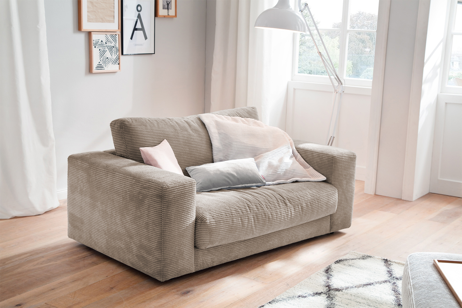 Bezug aus trendigem Cordstoff Gestell: tragende Teile aus Massivholz und Holzwerkstoffen Sitz: Unterfederung mit dauerelastischen Stahl-Wellenfedern und einer oberseitigen Abdeckung; Sitz aus PUR-Schaum Sitzkomfort: weicher und legerer Polsteraufbau; die Polsterung passt sich der Körperform an; Sitzabdrücke sowie Wellenbildung der Bezüge sind warentypisch Rücken: aus ergonomisch geformtem Schaumstoff Sitz und Rücken sind abgedeckt mit einem Inlett, welches befüllt ist mit hochwertigen Füllstoffen, die eine Beimischung von Federn enthalten. Fußvariante: Gleitfuß (Höhe: 5 cm) OHNE Kissen / OHNE Dekoration