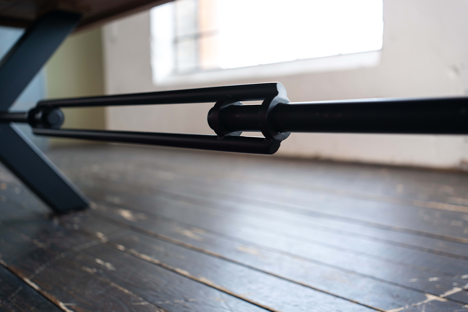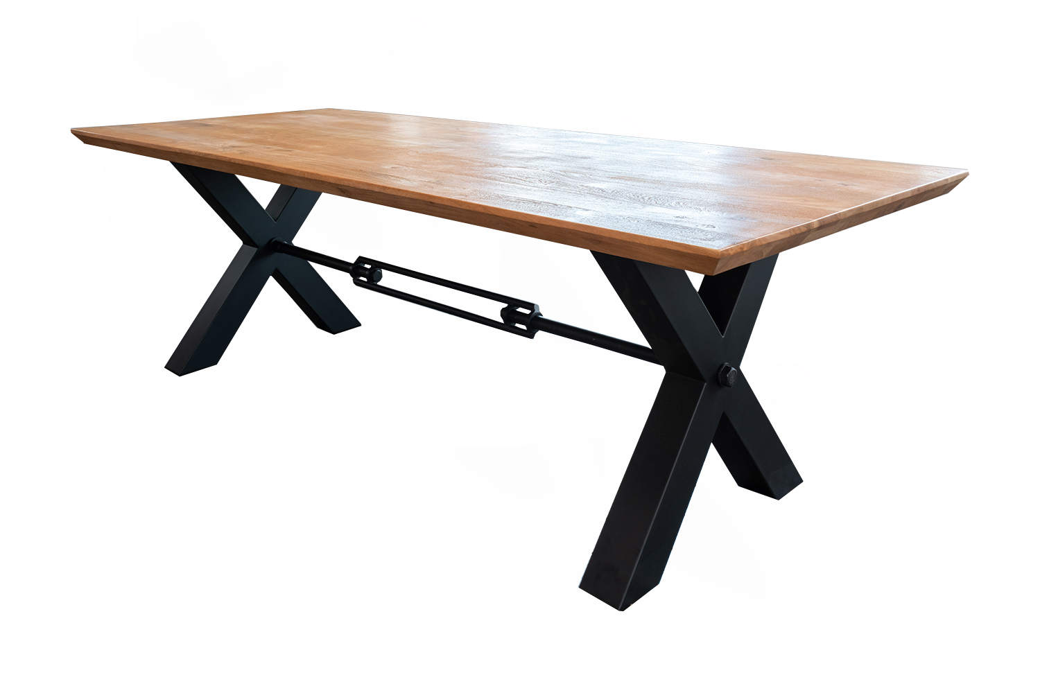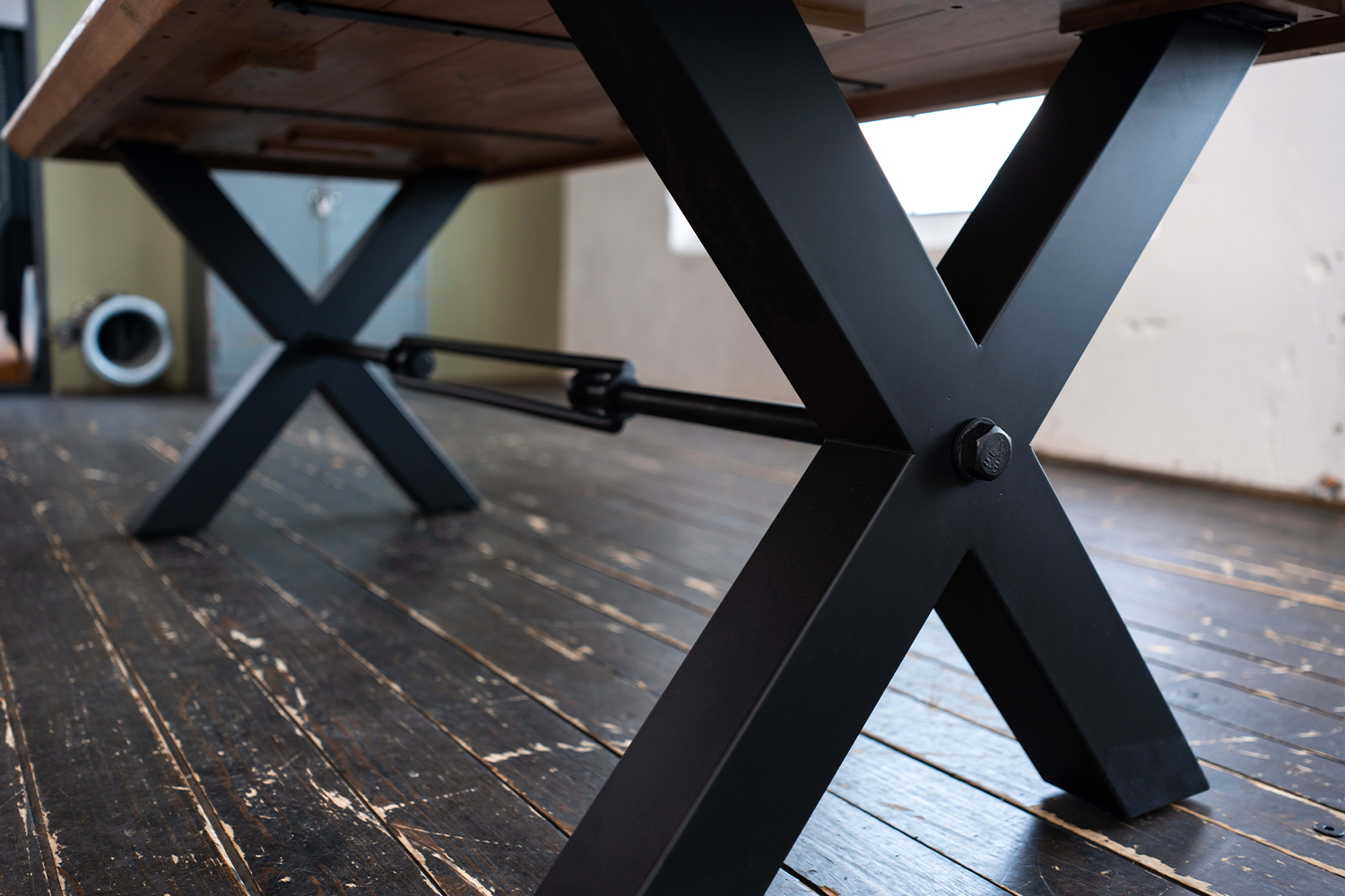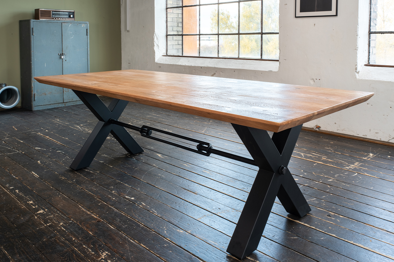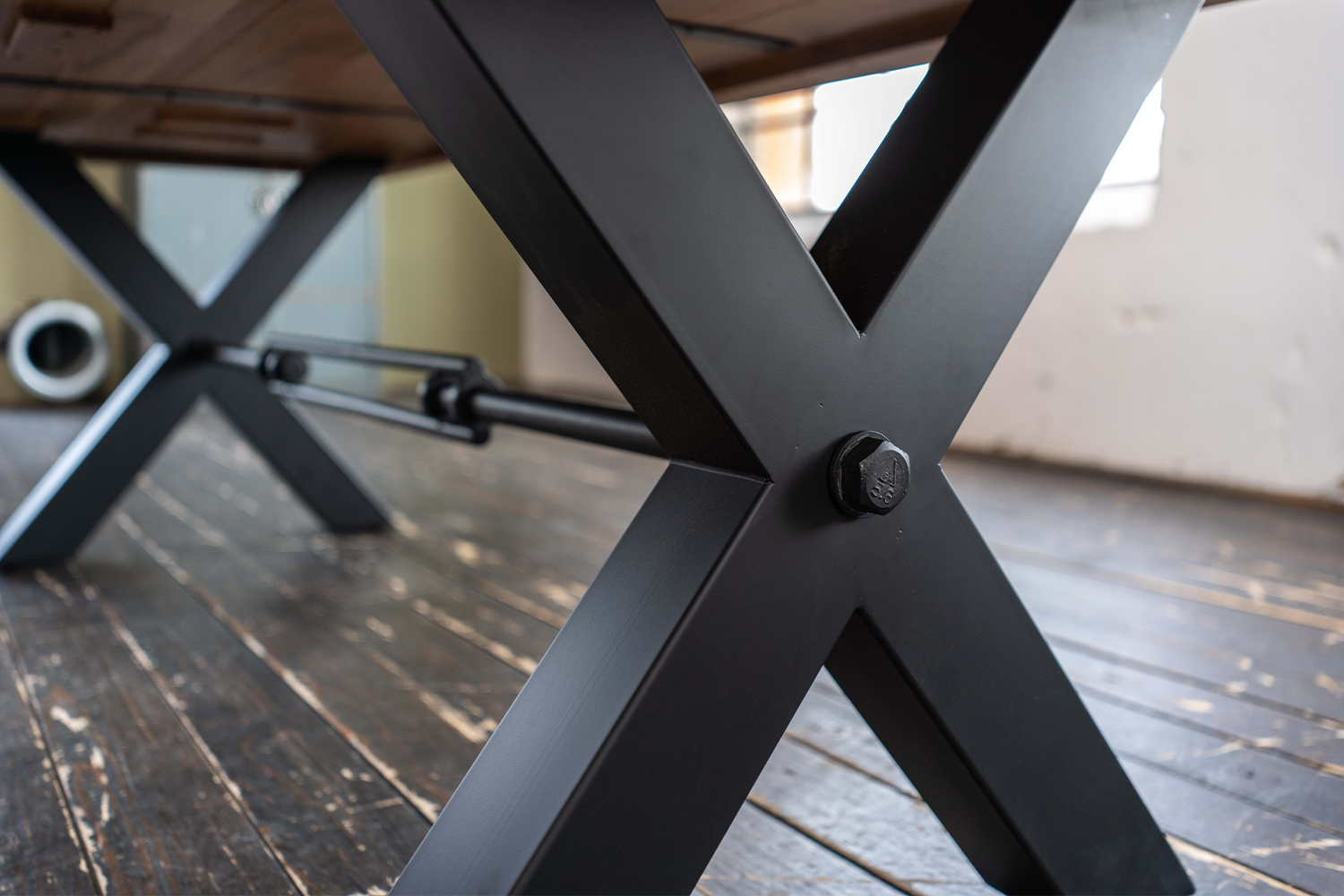 Das rustikal geschweißte Untergestell im Industriedesign, schwarz lackiert und mit zwei markanten X-Füßen, verleiht dem Tisch eine moderne, industrielle Note. Diese gelungene Kombination aus natürlichem Holz und robustem Metall macht den Tisch zu einem Design-Highlight in Ihrem Esszimmer.