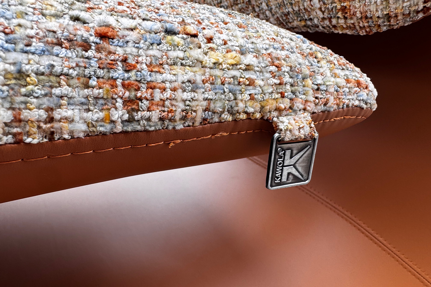 Die Vorderseite ist mit einem hochwertigen Strukturstoff in Melange-Optik bezogen. Das mehrfarbige Gewebe spielt mit warmen Naturtönen und sorgt für Tiefe und Lebendigkeit. Die Rückseite ist in glattes Kunstleder eingefasst – ein spannender Kontrast, der HAZEL seinen markanten Look verleiht.