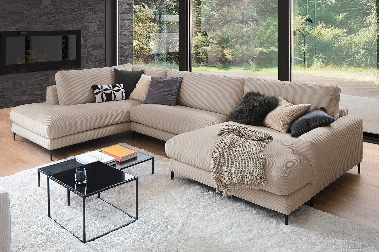Die KAWOLA Wohnlandschaft CARA in U-Form verbindet klassisches Design mit moderner Sachlichkeit und fügt sich nahtlos in jedes Interieur ein. Seine weichen Formen und der Bezug aus angesagtem Cord-Stoff verleihen dem Sofa eine zeitlose Eleganz. Die komplexe, 3-stufige Polsterung garantiert höchsten Sitzkomfort und passt sich durch ihren legeren Aufbau der Körperform an. Darüber hinaus ist das Sofa mit hochwertigen Kammerkissen ausgestattet. Um ein Stauchen des Füllmaterials zu verhindern, sollten diese Rückenkissen nach Gebrauch aufgeschüttelt werden. Egal zu welcher Gelegenheit - auf dem Sofa CARA findet jeder ein Plätzchen zum Entspannen!Produktdetails