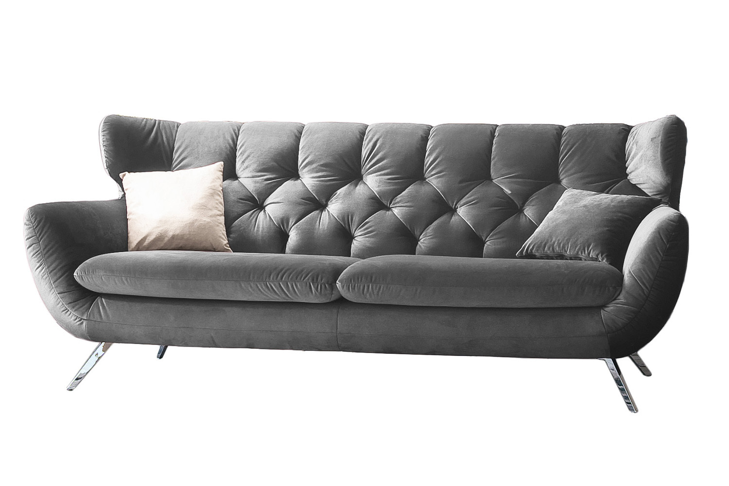 Der Stil des Sofas CHARME erinnert an die sechziger Jahre: Der Rücken wurde aufwendig abgesteppt ohne Knöpfe; die Rückenlehne wurde an den beiden Seiten leicht nach vorne gewölbt und erinnert an die Form eines Ohrensessels; die Füße aus Metall sind leicht ausgestellt.