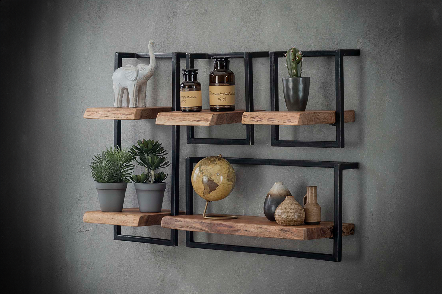Ergänzende Details: Material: Massives Akazienholz natur mit pulverbeschichtetem Metallrahmen Oberfläche: Matt transparenter Lack Design-Highlight: Kombination aus Naturholz und industriellem Stahl Einfache Befestigung mit zwei Befestigungsösen