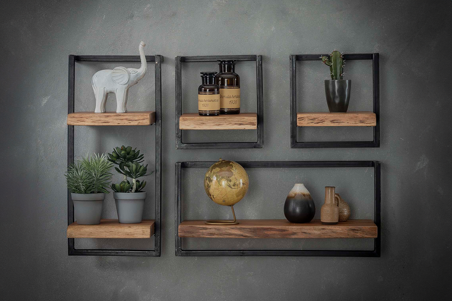 Das KAWOLA Wandregal ERGEA in 65 cm Größe ist eine perfekte Verbindung aus natürlicher Ästhetik und industriellem Design. Es besteht aus einem 61 cm breiten Regal aus massivem Akazienholz, dessen Enden eine robuste, geschliffene Baumstammform aufweisen, die für eine authentische und einzigartige Optik sorgt. Die Holzdiele wird von einem stabilen Vintage-Stahlrahmen umschlossen, der dem Regal seinen unverwechselbaren Charakter verleiht. Die Montage ist dank zweier Befestigungsösen einfach und sicher an der Wand.