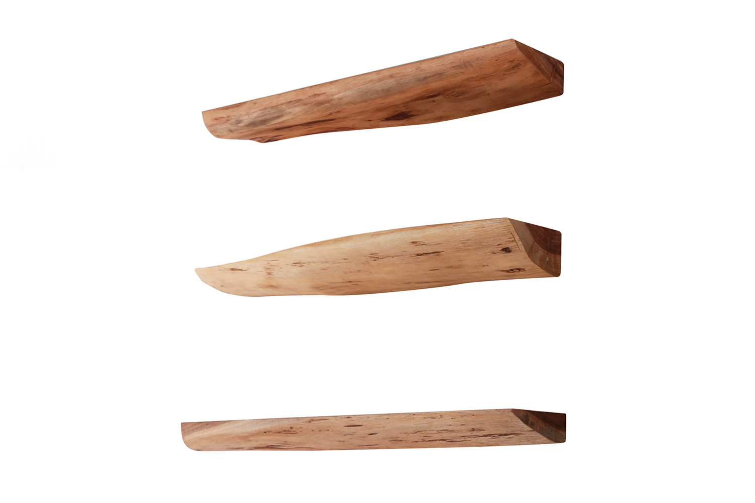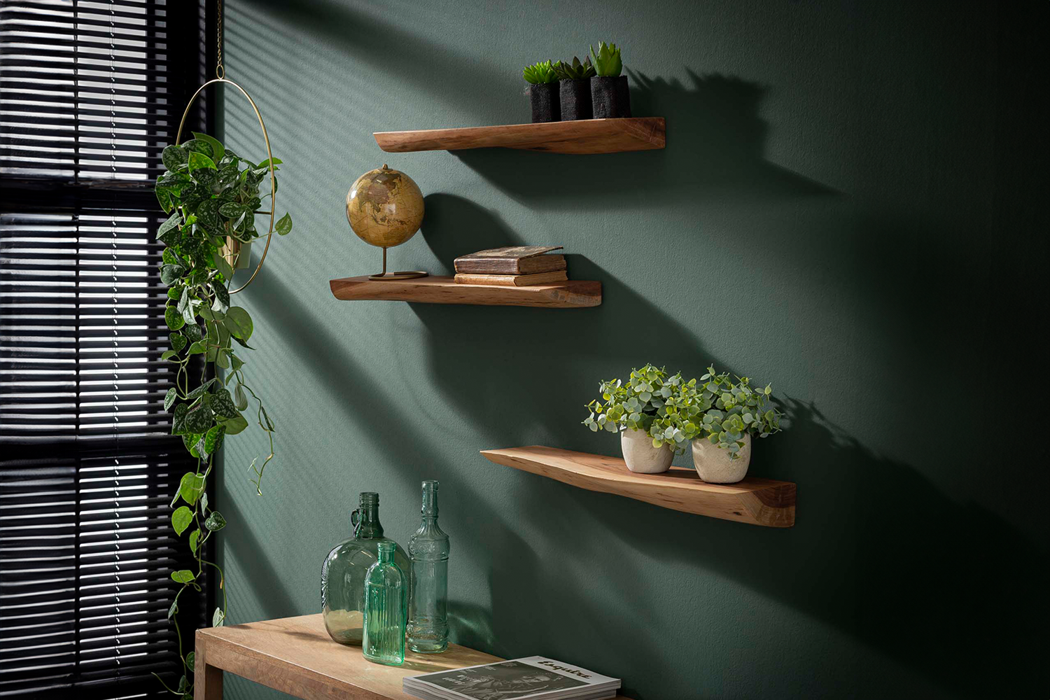 Ergänzende Details: Material: Massives Akazienholz, natur Design-Highlight: Originelle Baumstammform (FERHA) der Kanten Set-Inhalt: Drei Regale, jeweils 60 cm breit Optik: Schwebender Effekt für eine moderne und natürliche Ausstrahlung