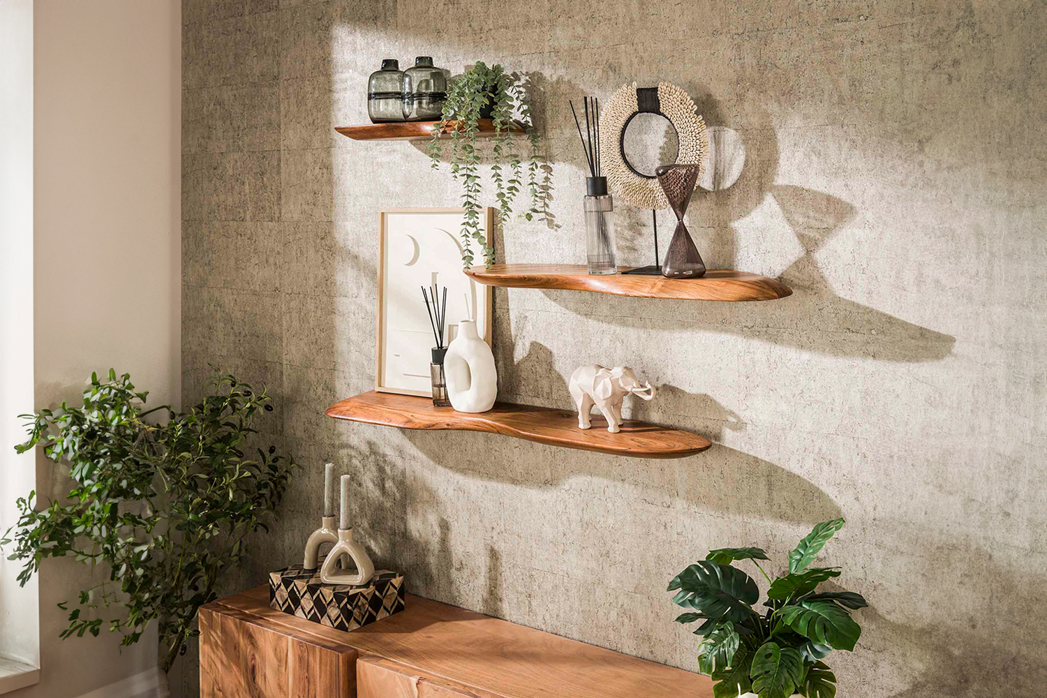 Ergänzende Details: Material: Massives Akazienholz, natur Oberfläche: Matt transparenter Lack, der die natürliche Holzstruktur hervorhebt Design: Set aus drei Dielen mit organischer Form für ein ruhiges, natürliches Aussehen Montage: Unsichtbare Befestigung mit mitgelieferten Nocken für schwebende Optik