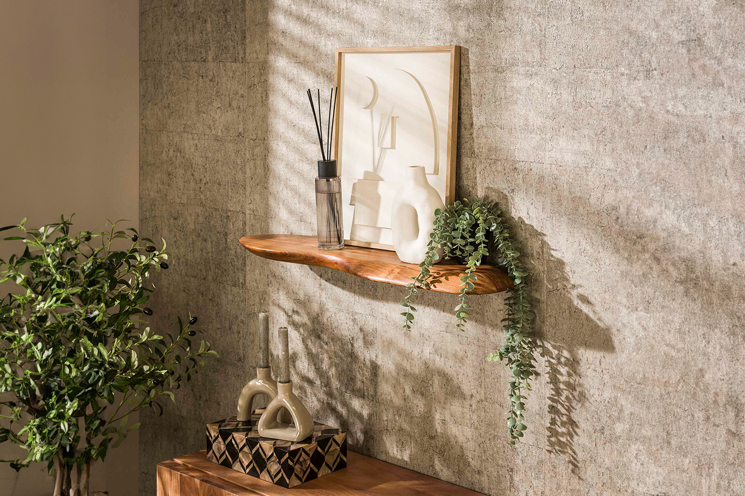 Das KAWOLA Wandregal HUZO 90 cm ist aus Akazienholz gefertigt und mit einem matten, transparenten Lack veredelt, der die natürliche Holzmaserung dezent hervorhebt. Seine organische Form und die warmen Farbtöne verleihen dem Regal eine ruhige Ausstrahlung. Die Montage ist dank der mitgelieferten unsichtbaren Nocken ganz einfach, sodass das Regal scheinbar an der Wand schwebt. Mit seiner Länge von 90 cm ist es vielseitig einsetzbar.