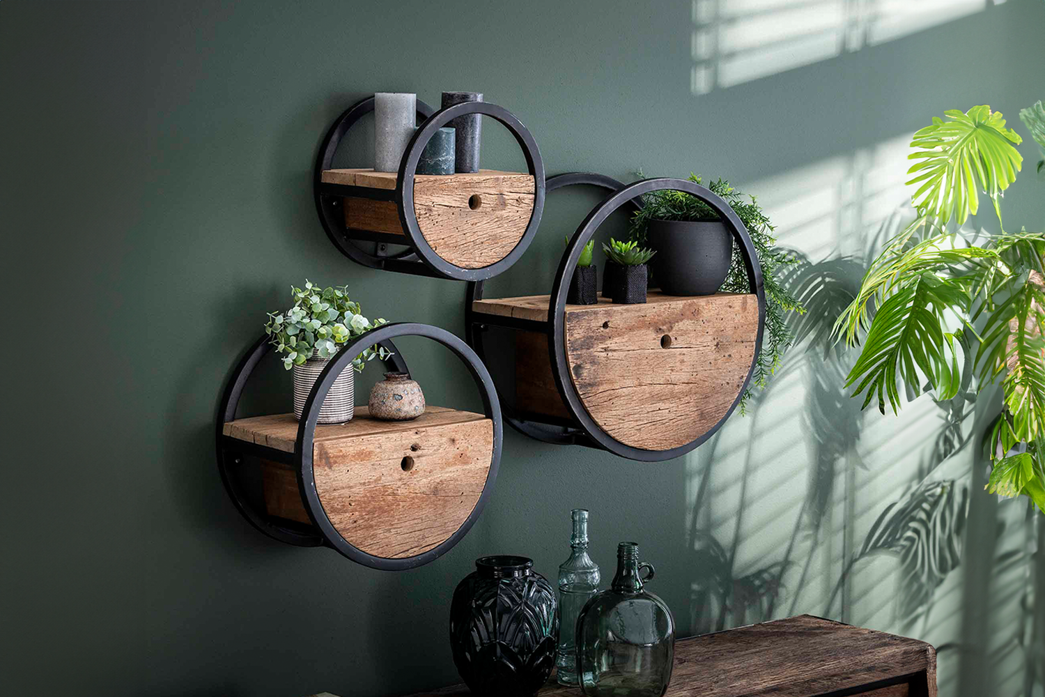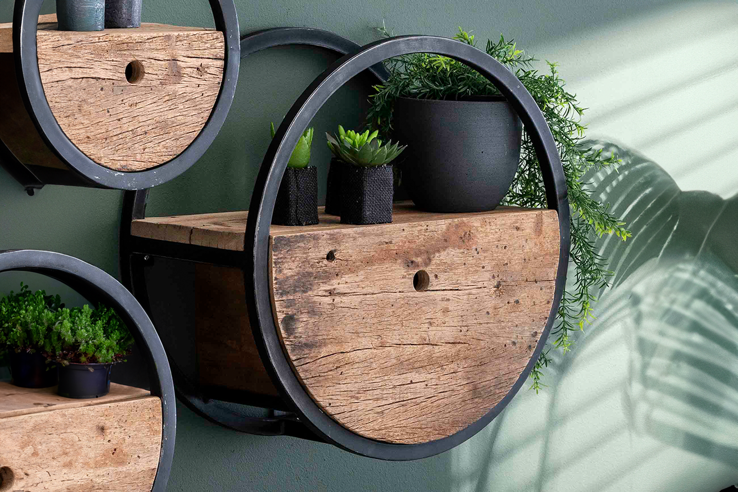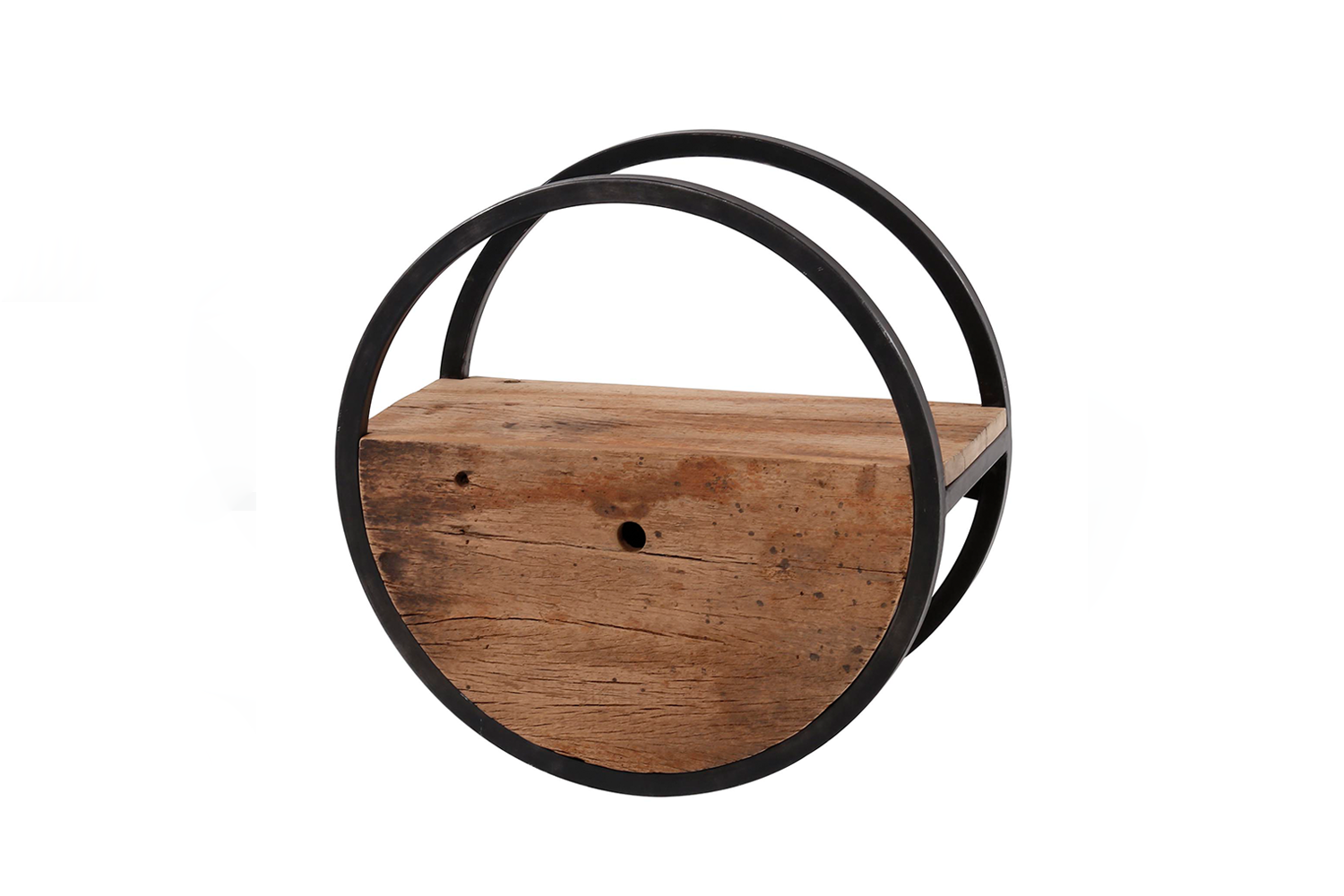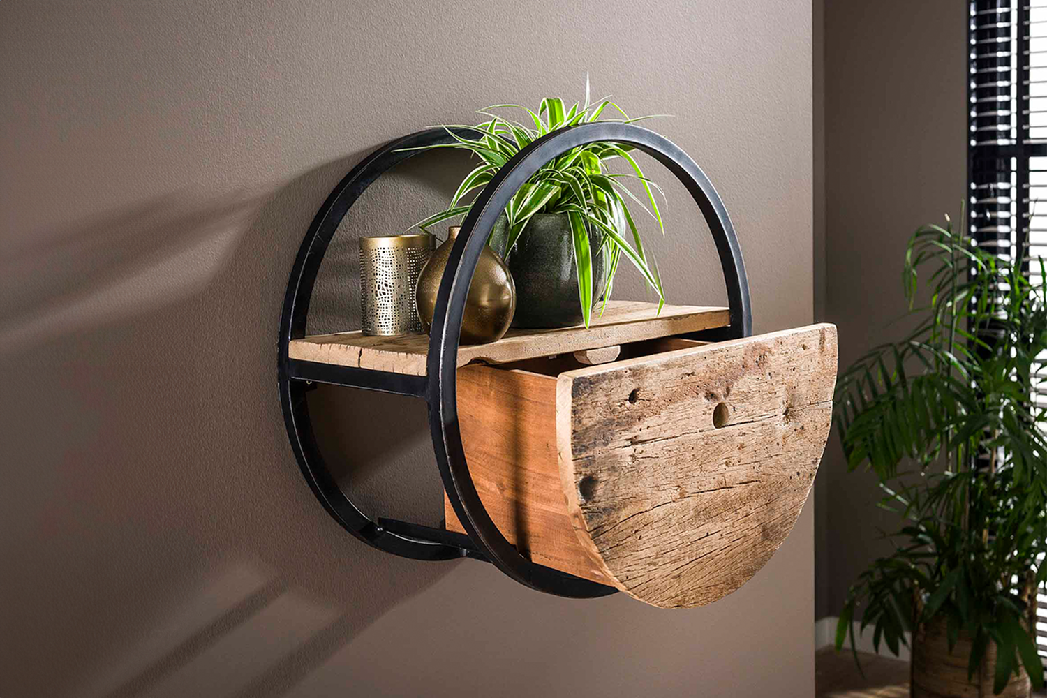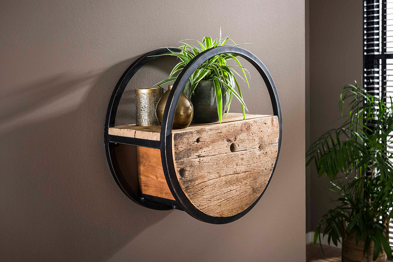 Ergänzende Details: Material: Recyceltes Hartholz natur mit schwarzem Metallrahmen Design: Rundes Wandregal mit integrierter Schublade Stil: Raue Naturholzoptik trifft auf modernen Industrielook Mit einem Durchmesser von 50 cm ist es ein kompaktes, besonderes Möbelstück