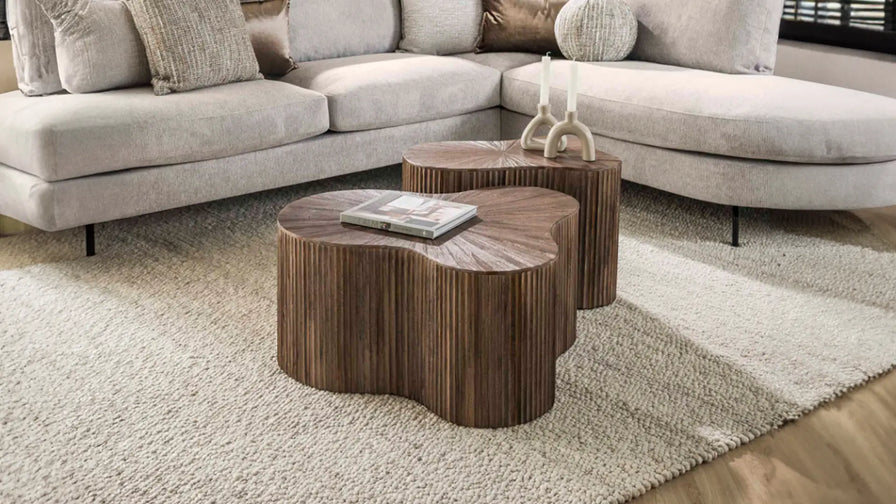 Das zweiteilige Set besticht durch Kleeblatt-Form, wellenförmige Beine und edles Teakholz. Die dunkelbraune Farbe und das raffinierte Design machen es zu einem flexiblen Blickfang in jedem Raum.