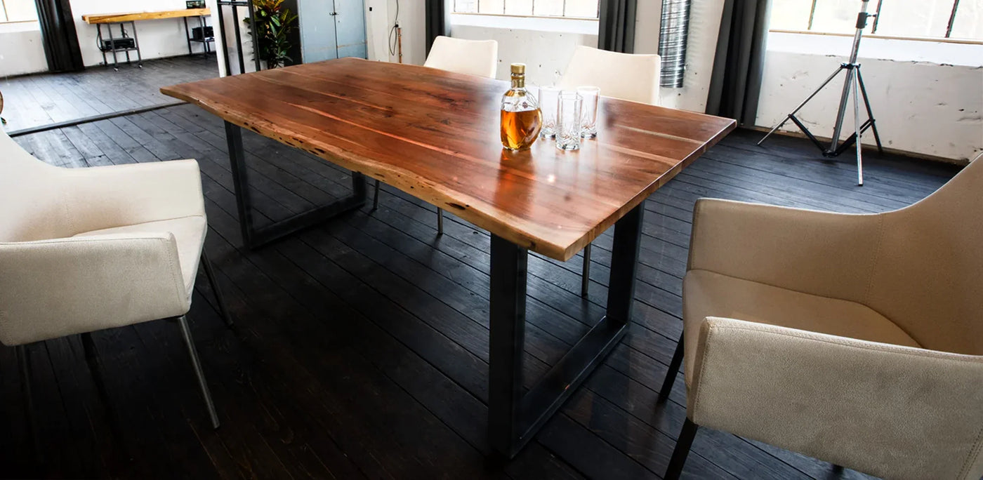 Wunderschöner Esstisch, mit Massivholzplatte, der sich wunderbar in das moderne, aber auch das rustikal gemütliche Wohnambiente integrieren lässt. Besonderes Highlight des Esstisches sind die Tischkanten, die den natürlichen Formen eines Baumes entsprechen. Das kubische Metallgestell bildet hierzu einen gelungenen Kontrast, der dem Massivholz Esstisch einen Hauch industriellen Charme verleiht.