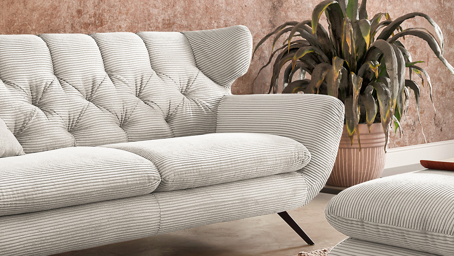 Das KAWOLA Sofa CHARME ist etwas ganz Besonderes! Es ist nicht nur ein Möbelstück, sondern ein wahres Design-Highlight, das neue Akzente im Wohnraum setzt. Der Stil des Sofas CHARME erinnert an die sechziger Jahre: Der Rücken wurde aufwendig abgesteppt ohne Knöpfe; die Rückenlehne wurde an den beiden Seiten leicht nach vorne gewölbt und erinnert an die Form eines Ohrensessels; die Füße aus Metall sind leicht ausgestellt. Die Polsterung des Sofas besteht aus PUR-Schaum und besticht durch ihren weichen und legeren Sitzkomfort. Die Sitzkissen passen sich der Körperform angenehm an. Selbstverständlich wurde das Sofa komplett in Cord bezogen, so dass es auch frei in den Raum gestellt werden kann. Wer nicht nur ein Sofa sucht, sondern ein ganz besonderes Highlight, der liegt mit dem KAWOLA Sofa CHARME goldrichtig!