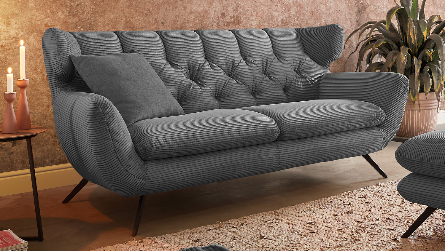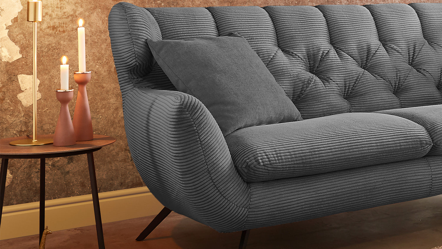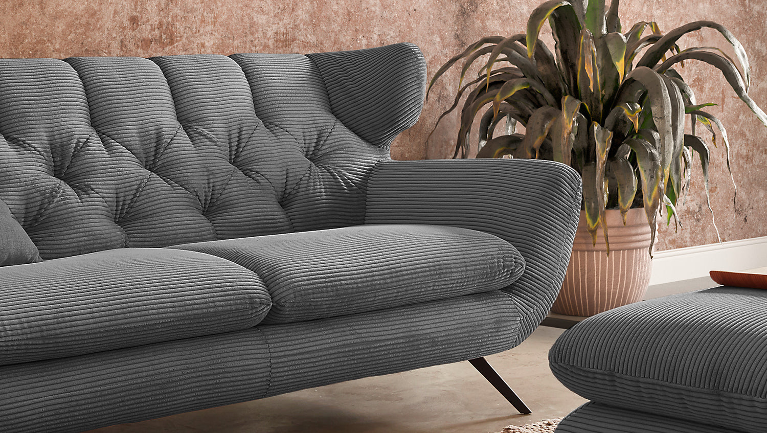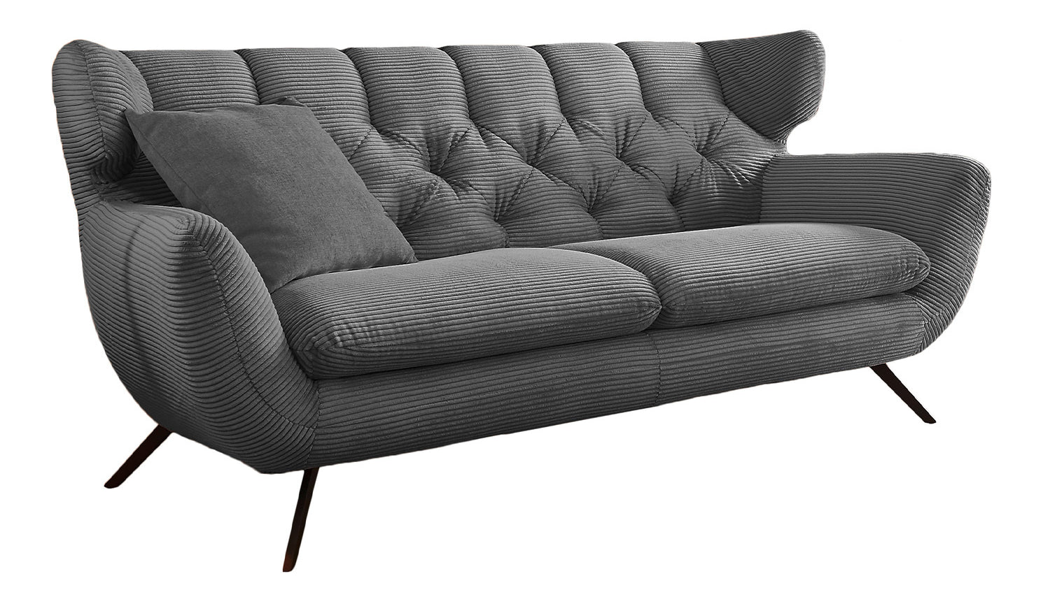 Das KAWOLA Sofa CHARME ist etwas ganz Besonderes! Es ist nicht nur ein Möbelstück, sondern ein wahres Design-Highlight, das neue Akzente im Wohnraum setzt. Der Stil des Sofas CHARME erinnert an die sechziger Jahre: Der Rücken wurde aufwendig abgesteppt ohne Knöpfe; die Rückenlehne wurde an den beiden Seiten leicht nach vorne gewölbt und erinnert an die Form eines Ohrensessels; die Füße aus Metall sind leicht ausgestellt. Die Polsterung des Sofas besteht aus PUR-Schaum und besticht durch ihren weichen und legeren Sitzkomfort. Die Sitzkissen passen sich der Körperform angenehm an. Selbstverständlich wurde das Sofa komplett in Cord bezogen, so dass es auch frei in den Raum gestellt werden kann. Wer nicht nur ein Sofa sucht, sondern ein ganz besonderes Highlight, der liegt mit dem KAWOLA Sofa CHARME goldrichtig!