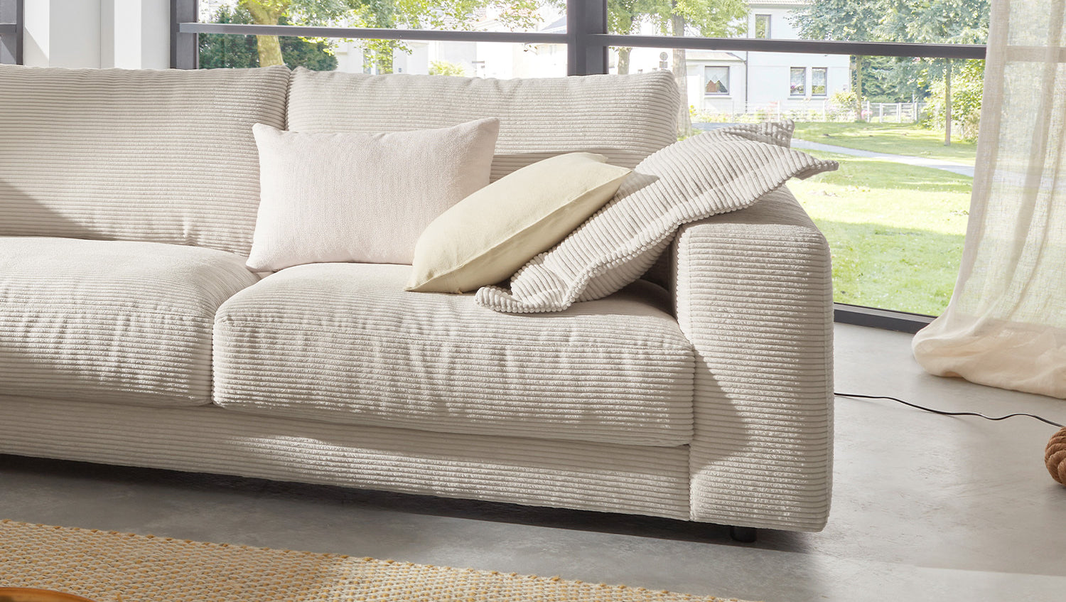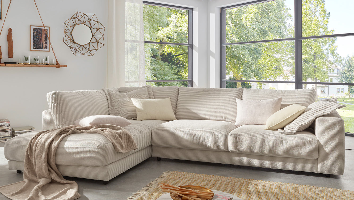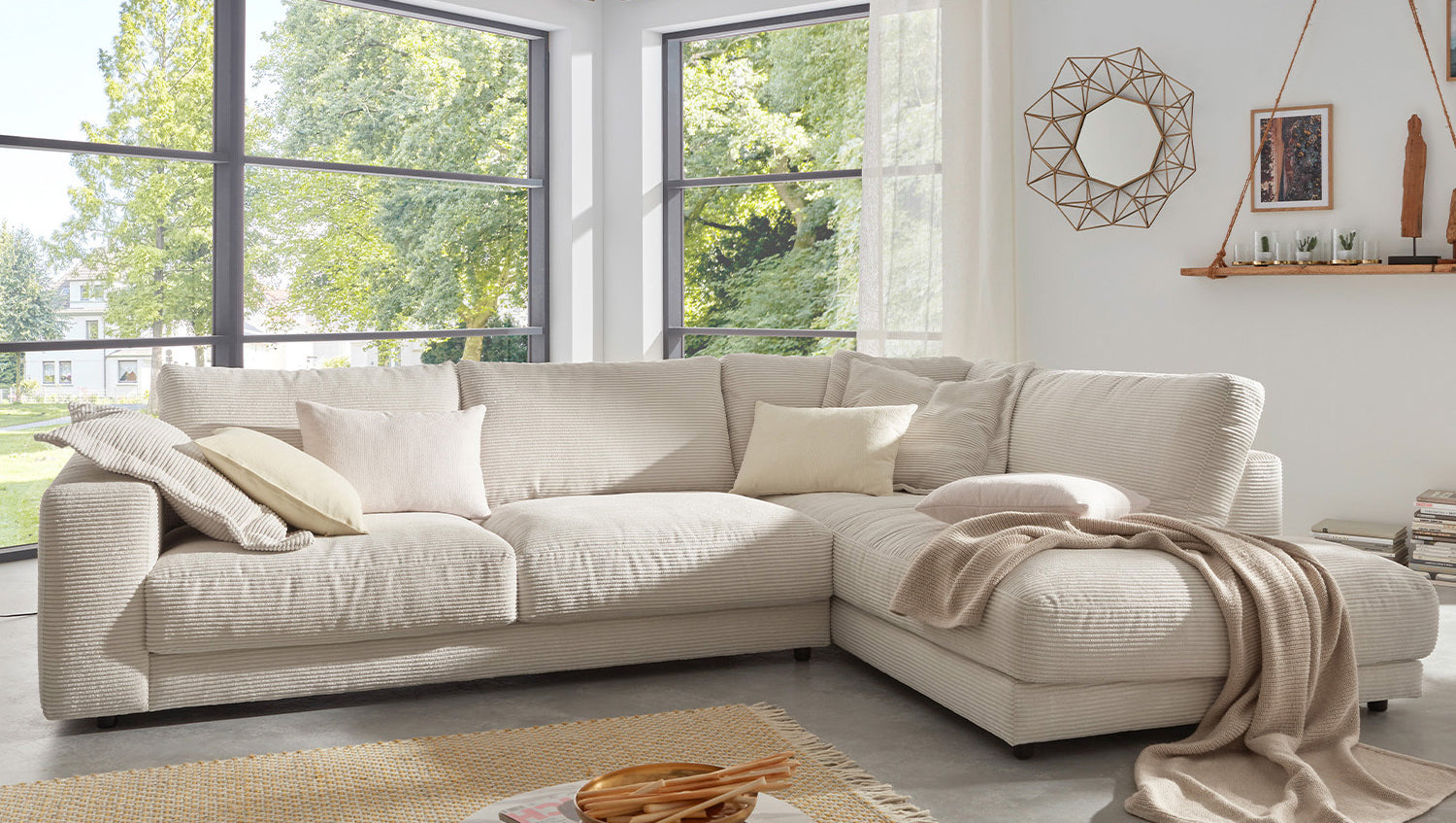 Das KAWOLA Ecksofa MADELINE besticht durch seinen hervorragenden Sitzkomfort, der durch die äußerst legere Polsterung zustande kommt und zum Verweilen und Entspannen einlädt. Die Polsterung passt sich der Körperform an; Sitzabdrücke sowie Wellenbildung der Bezüge sind warentypisch. Der Sitz besteht aus einer Unterfederung mit dauerelastischen Stahl-Wellenfedern und einer oberseitigen Abdeckung sowie losen Sitzkissen aus PUR-Schaum. Sitz und Rücken sind abgedeckt mit einem Inlett, welches befüllt ist mit hochwertigen Füllstoffen, die eine Beimischung von Federn enthalten. Der Bezug aus trendigem Cord-Stoff verleiht dem Big Sofa eine zeitlose Eleganz. Wenn Sie Ihrem Wohnzimmer einen außergewöhnlichen Anstrich verleihen wollen, ist das Sofa MADELINE definitiv das Richtige für Sie!