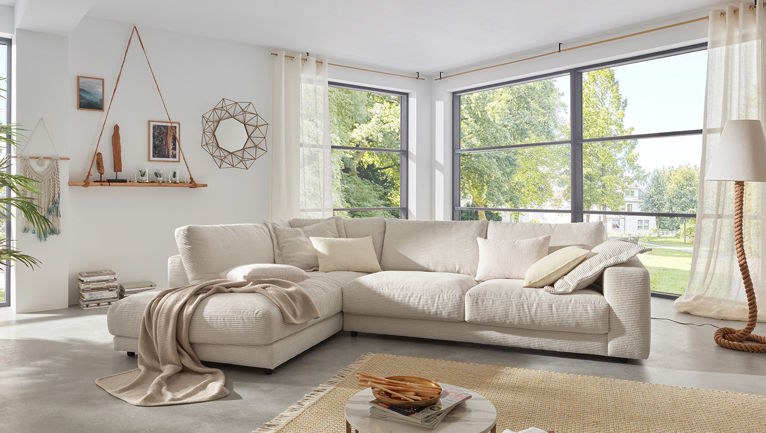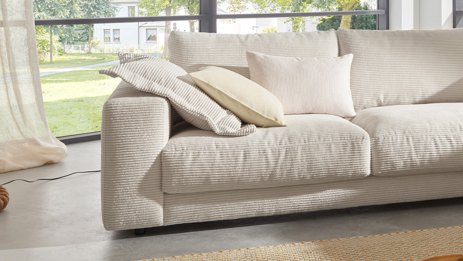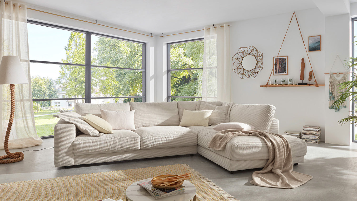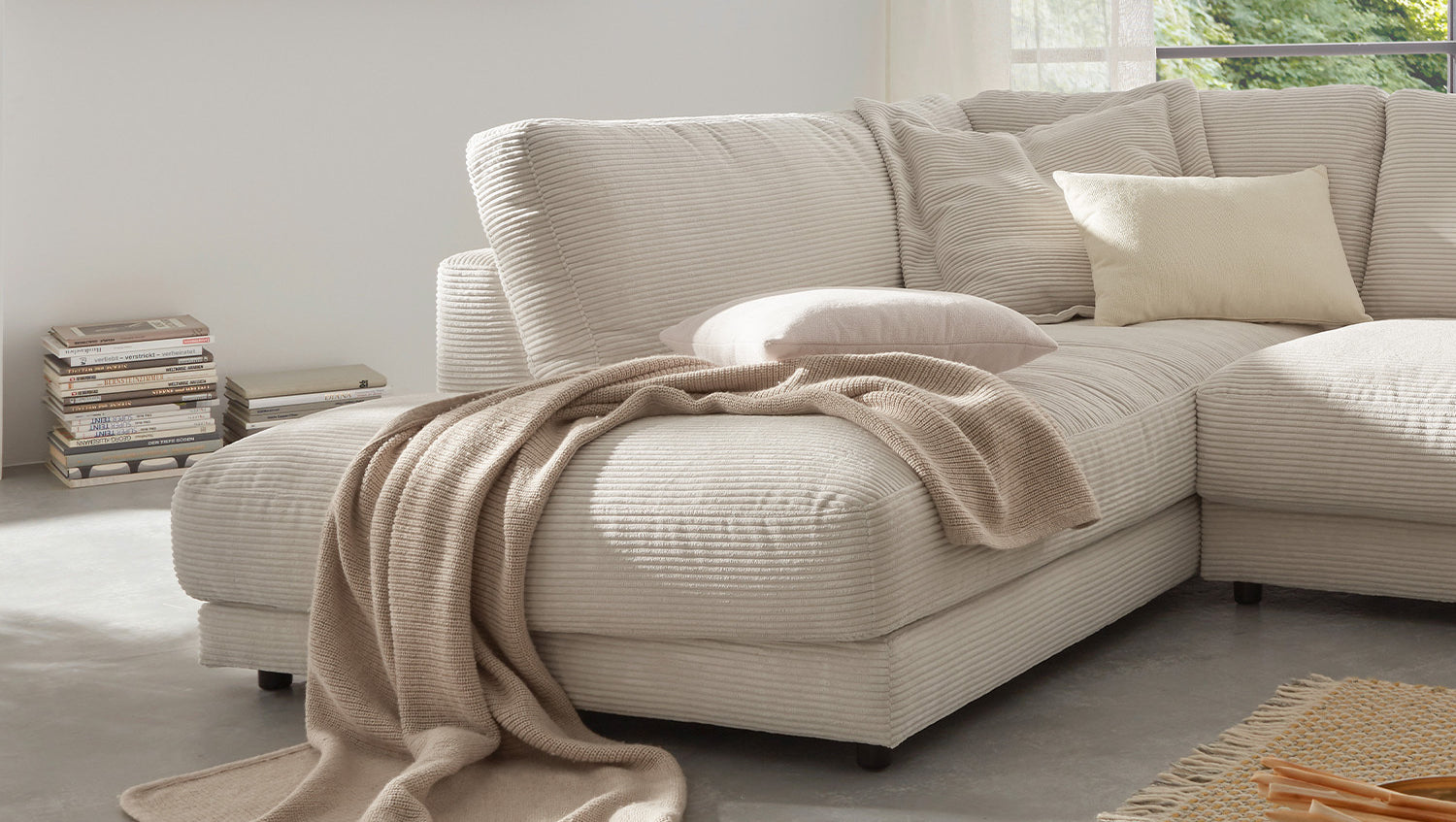 Das KAWOLA Ecksofa MADELINE besticht durch seinen hervorragenden Sitzkomfort, der durch die äußerst legere Polsterung zustande kommt und zum Verweilen und Entspannen einlädt. Die Polsterung passt sich der Körperform an; Sitzabdrücke sowie Wellenbildung der Bezüge sind warentypisch. Der Sitz besteht aus einer Unterfederung mit dauerelastischen Stahl-Wellenfedern und einer oberseitigen Abdeckung sowie losen Sitzkissen aus PUR-Schaum. Sitz und Rücken sind abgedeckt mit einem Inlett, welches befüllt ist mit hochwertigen Füllstoffen, die eine Beimischung von Federn enthalten. Der Bezug aus trendigem Cord-Stoff verleiht dem Big Sofa eine zeitlose Eleganz. Wenn Sie Ihrem Wohnzimmer einen außergewöhnlichen Anstrich verleihen wollen, ist das Sofa MADELINE definitiv das Richtige für Sie!