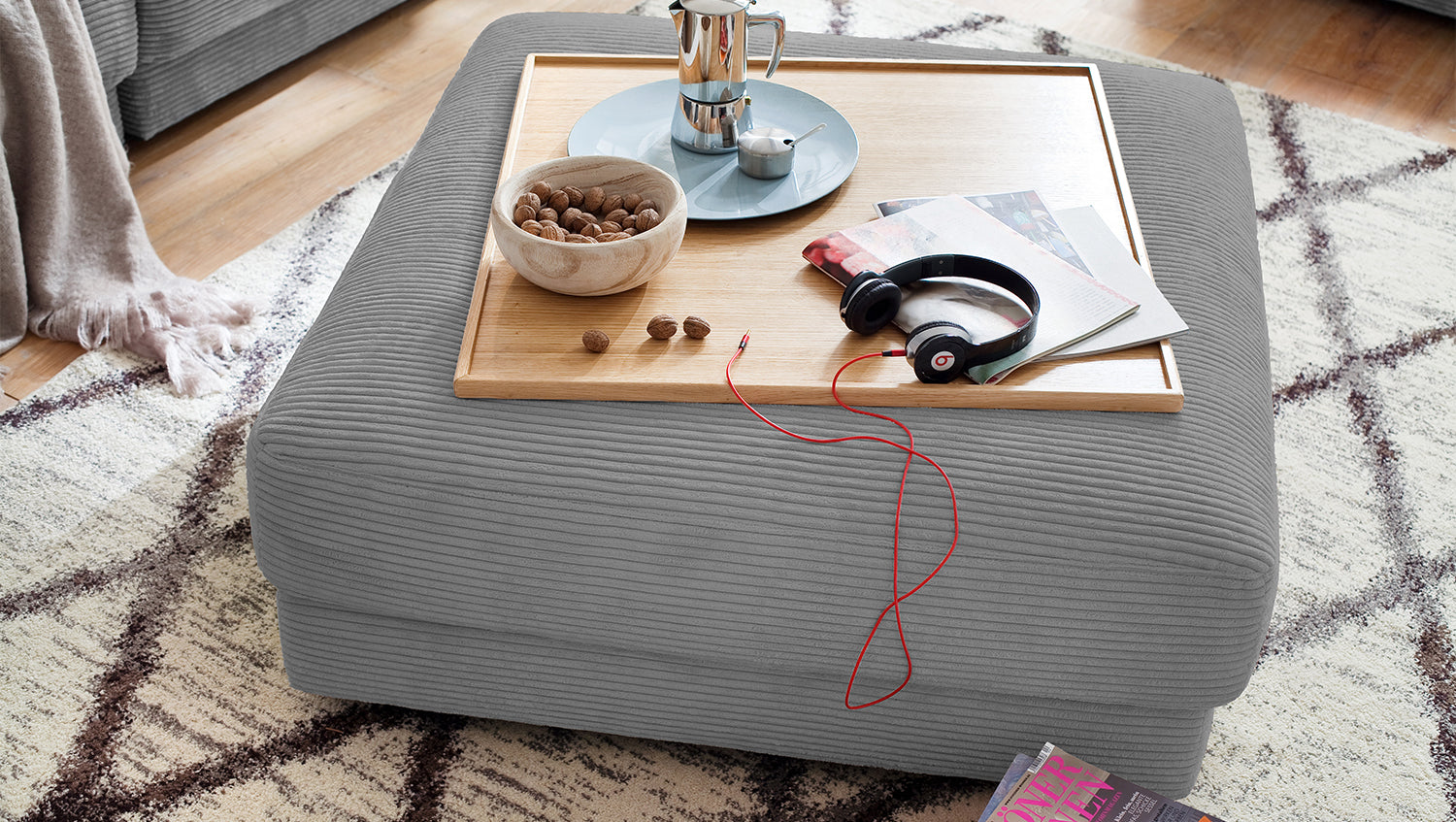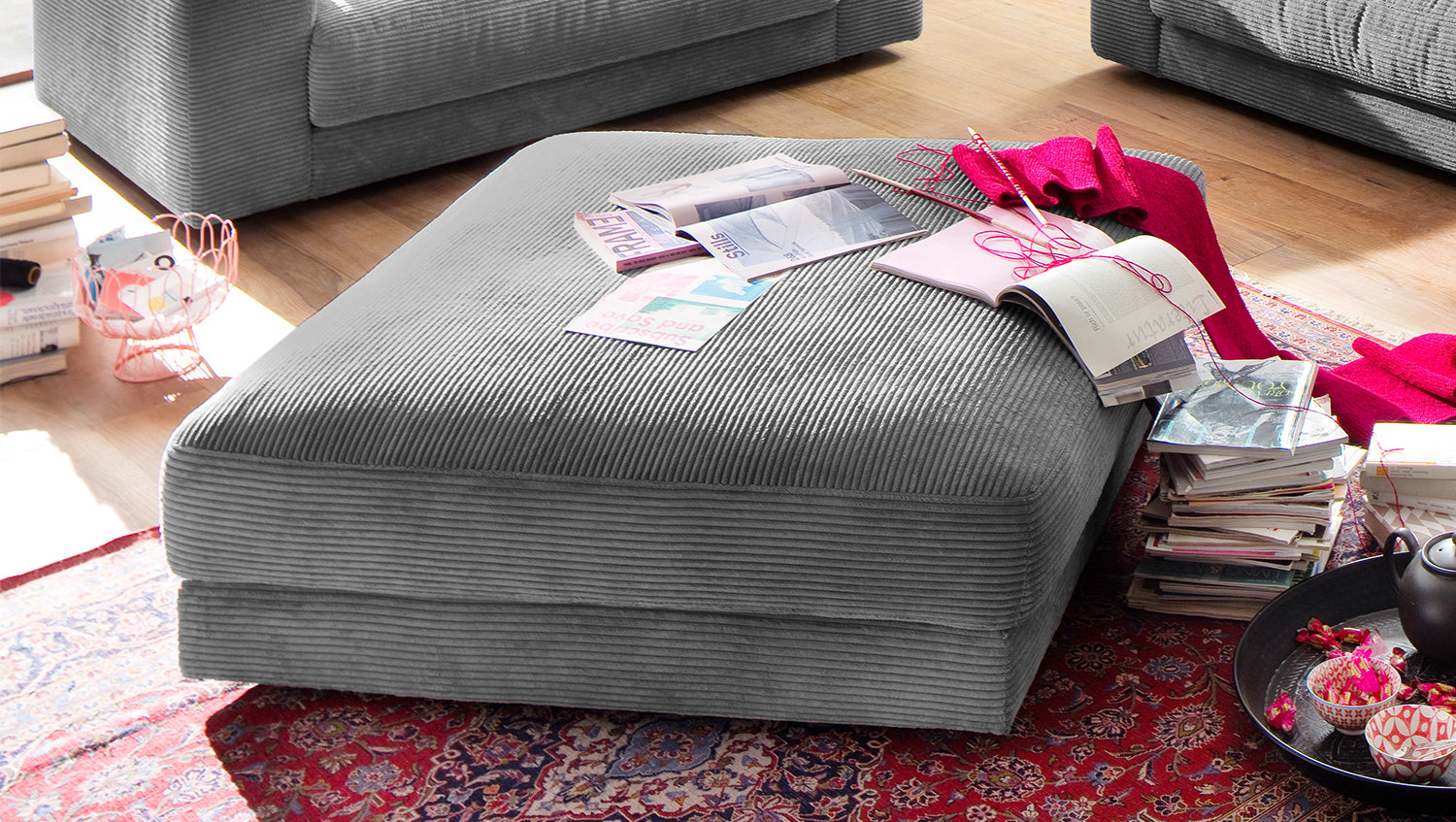 KAWOLA Big Hocker MADELINE Polsterhocker Cord grau