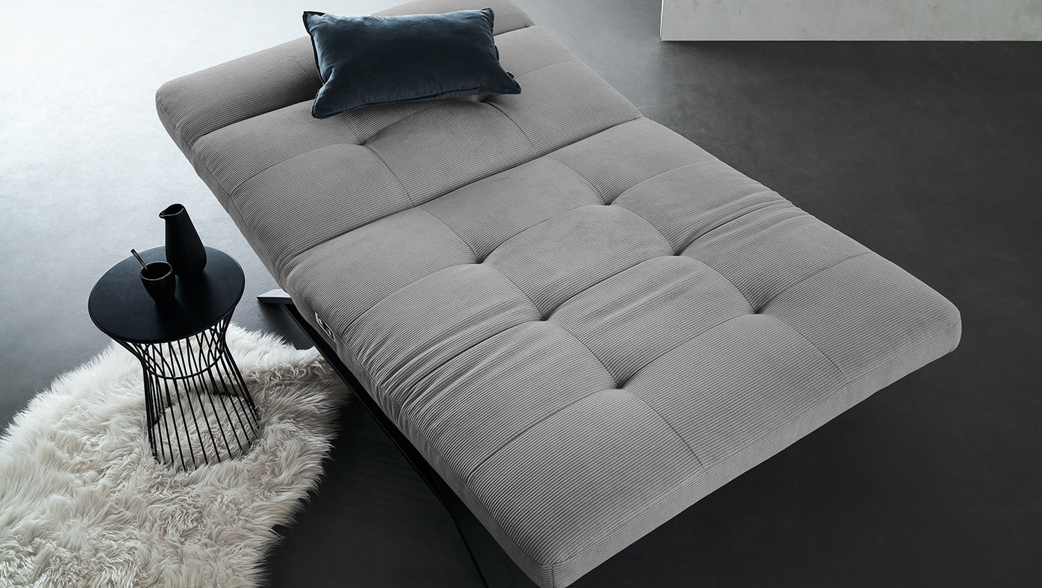 Die KAWOLA Liege AMERIVA ist eine wunderbare Kombination aus Design und Funktion. Die Metallkufen in schwarz matt bilden den Kontrast zum Bezug aus filigranem Feincord.
