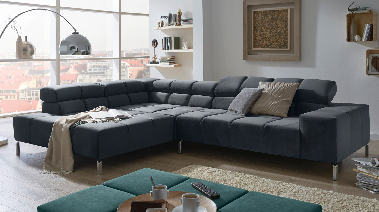 Das KAWOLA Ecksofa NELSON verbindet moderne Designwelten mit zeitloser Eleganz und fügt sich nahtlos in jedes Interieur ein. Seine kubische Form und die hohen Metallfüße verleihen dem Sofa eine gewisse Leichtigkeit, die durch die quadratischen Absteppungen noch unterstrichen wird. Die Kopfstützen können ganz nach den individuellen Sitzvorlieben entweder hoch-oder heruntergeklappt werden. Die komplexe, 3-stufige Polsterung garantiert außerdem höchsten Sitzkomfort. Selbstverständlich wurde das Sofa auch auf der Rückseite mit dem hochwertigen Velvet-Stoff bezogen, sodass es auch frei in den Raum gestellt eine gute Figur macht. Egal zu welcher Gelegenheit - auf dem Sofa NELSON findet jeder ein Plätzchen zum Entspannen!