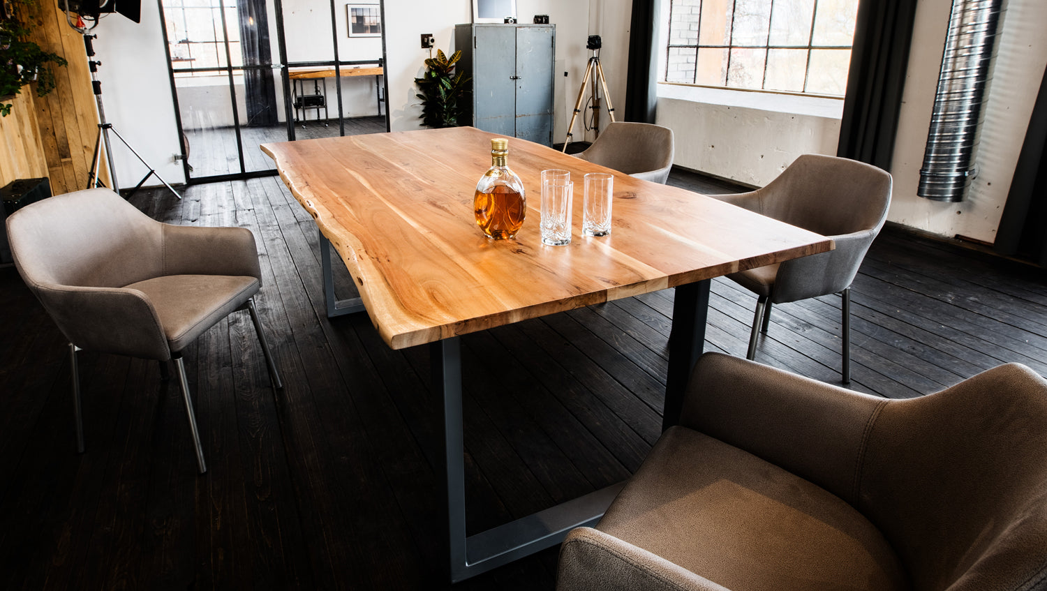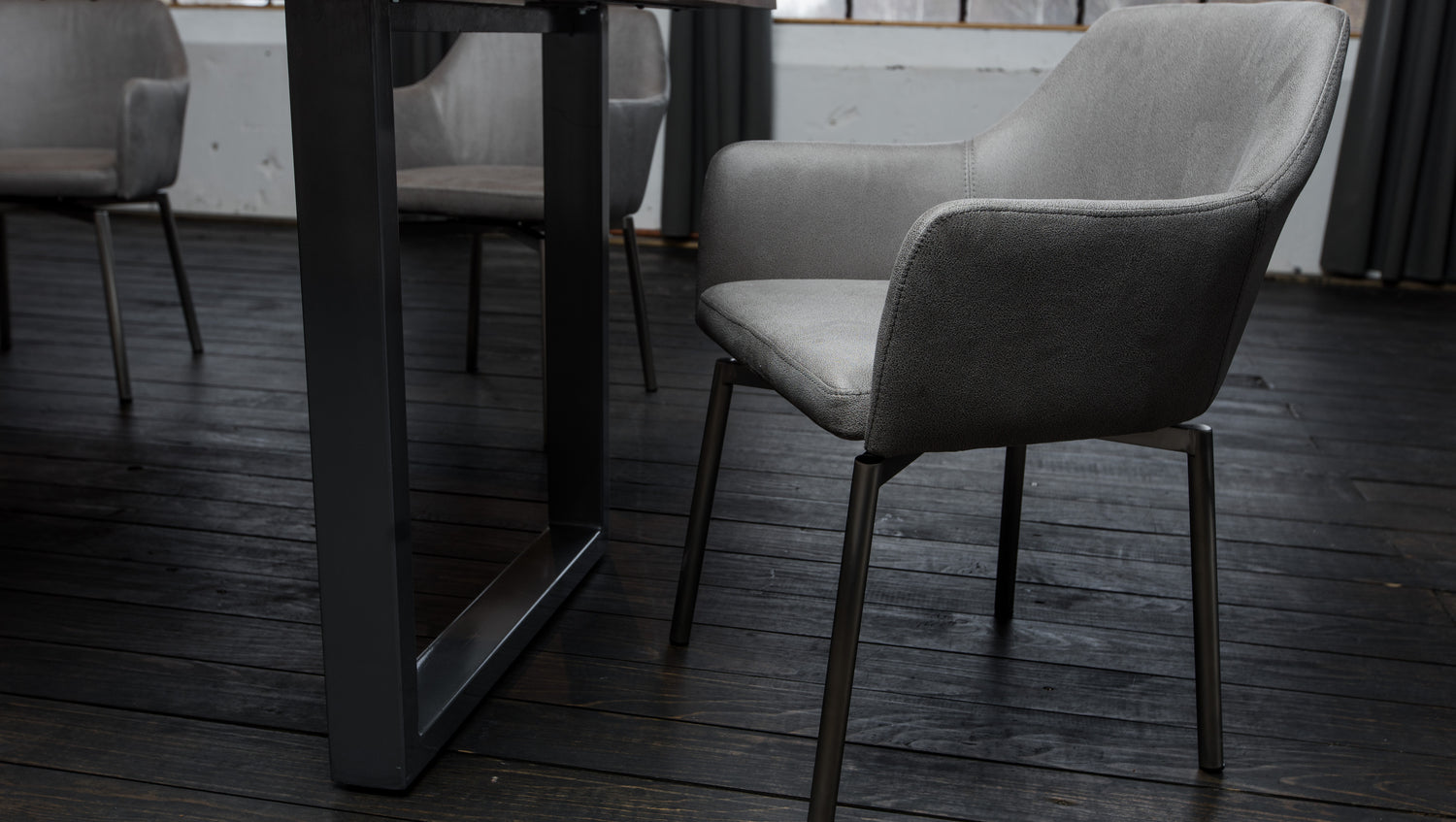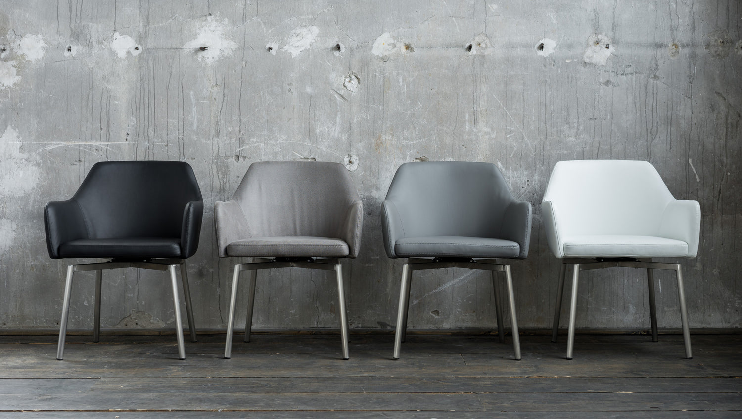 Das Gestell in Edelstahl harmonisiert hervorragend mit der Wahl des Bezuges und verleht dem Stuhl seinen modernen Charakter.