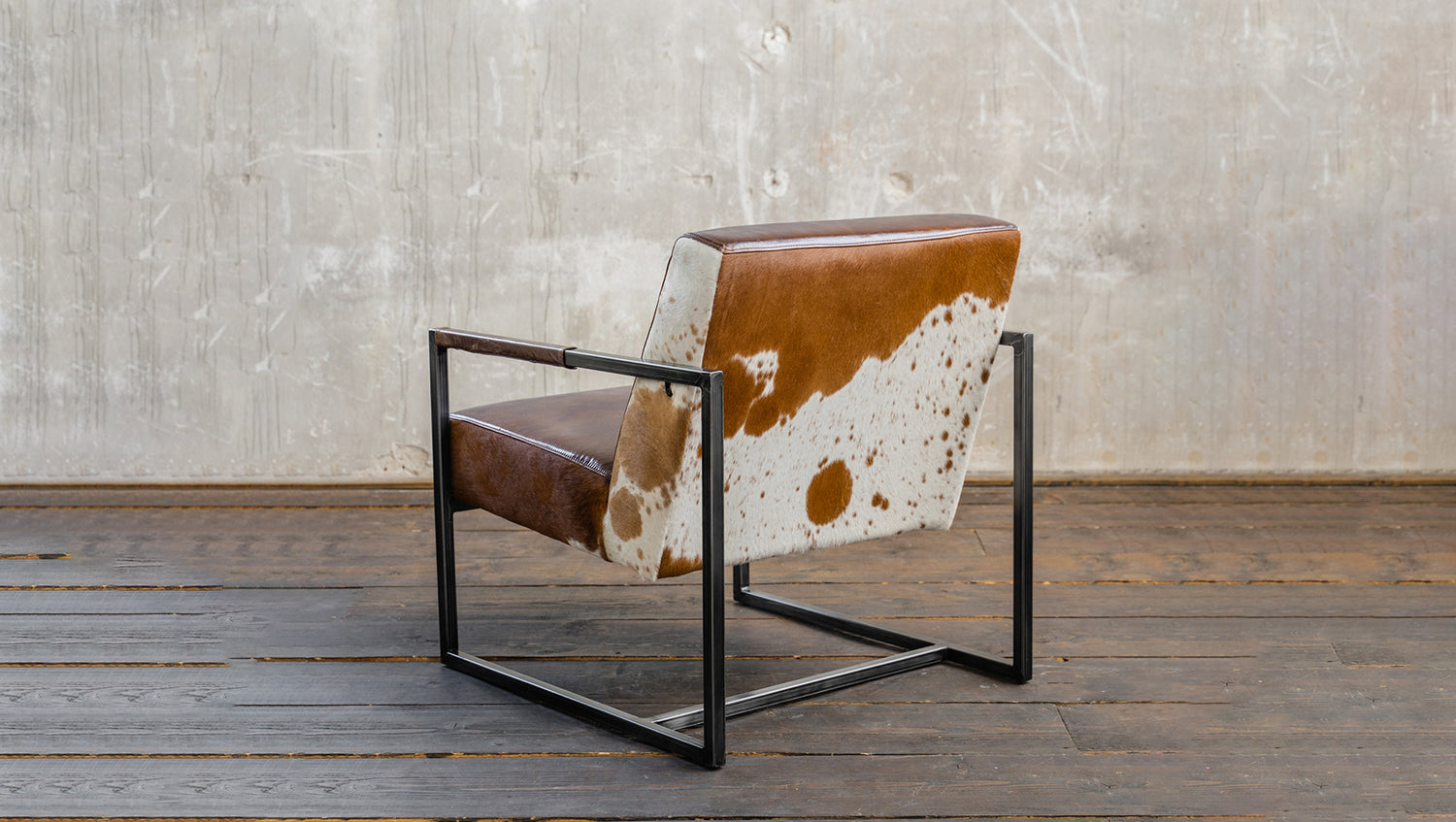 Das Gestell aus Edelstahl ist kubisch geformt und aus schwarzem Metall gefertigt. Die Armlehnen sind zum Teil mit Leder verkleidet.