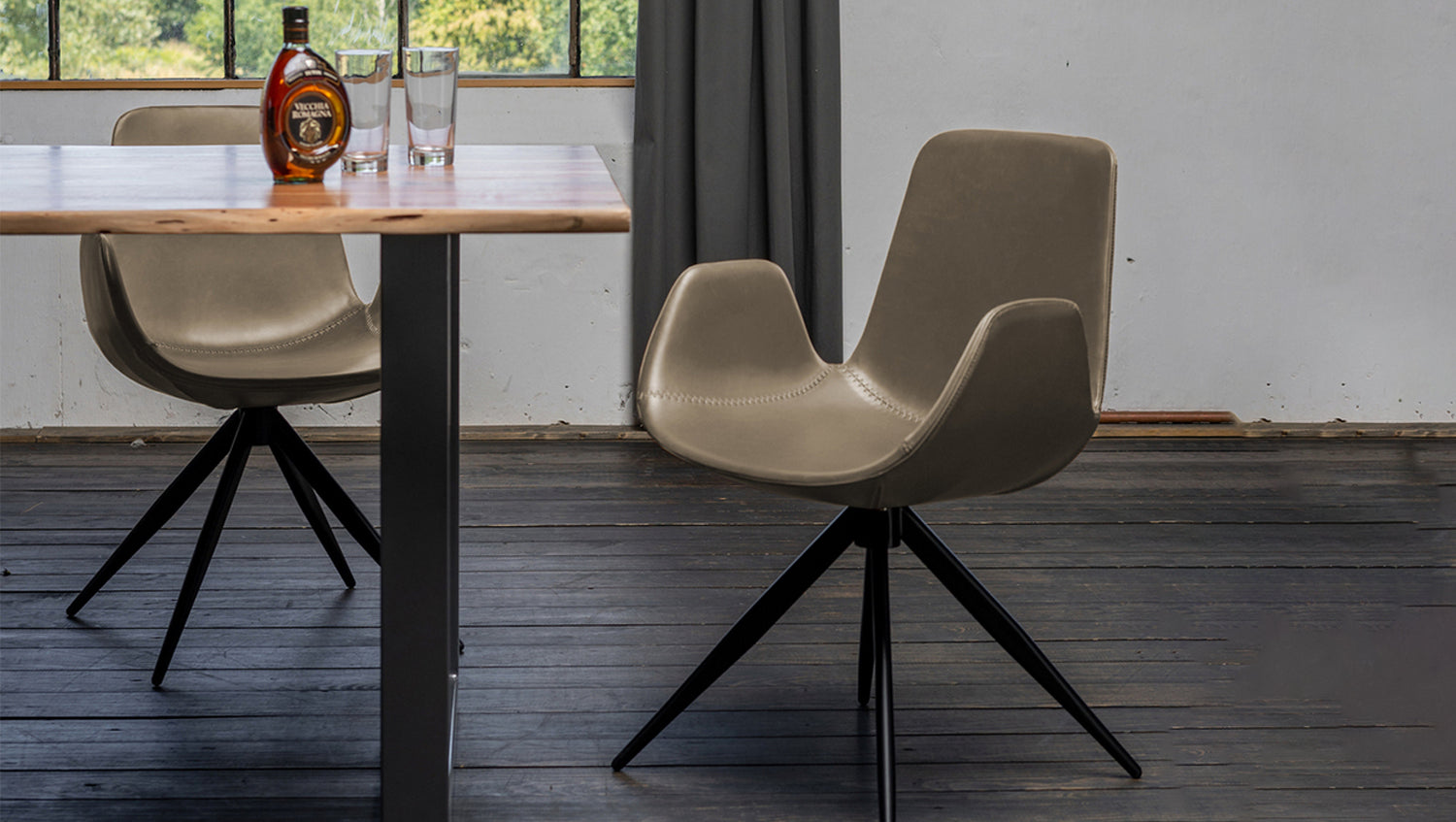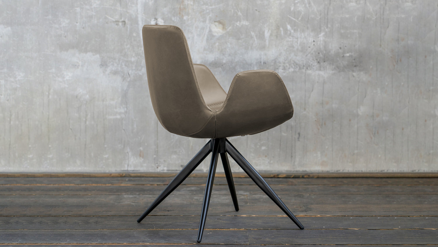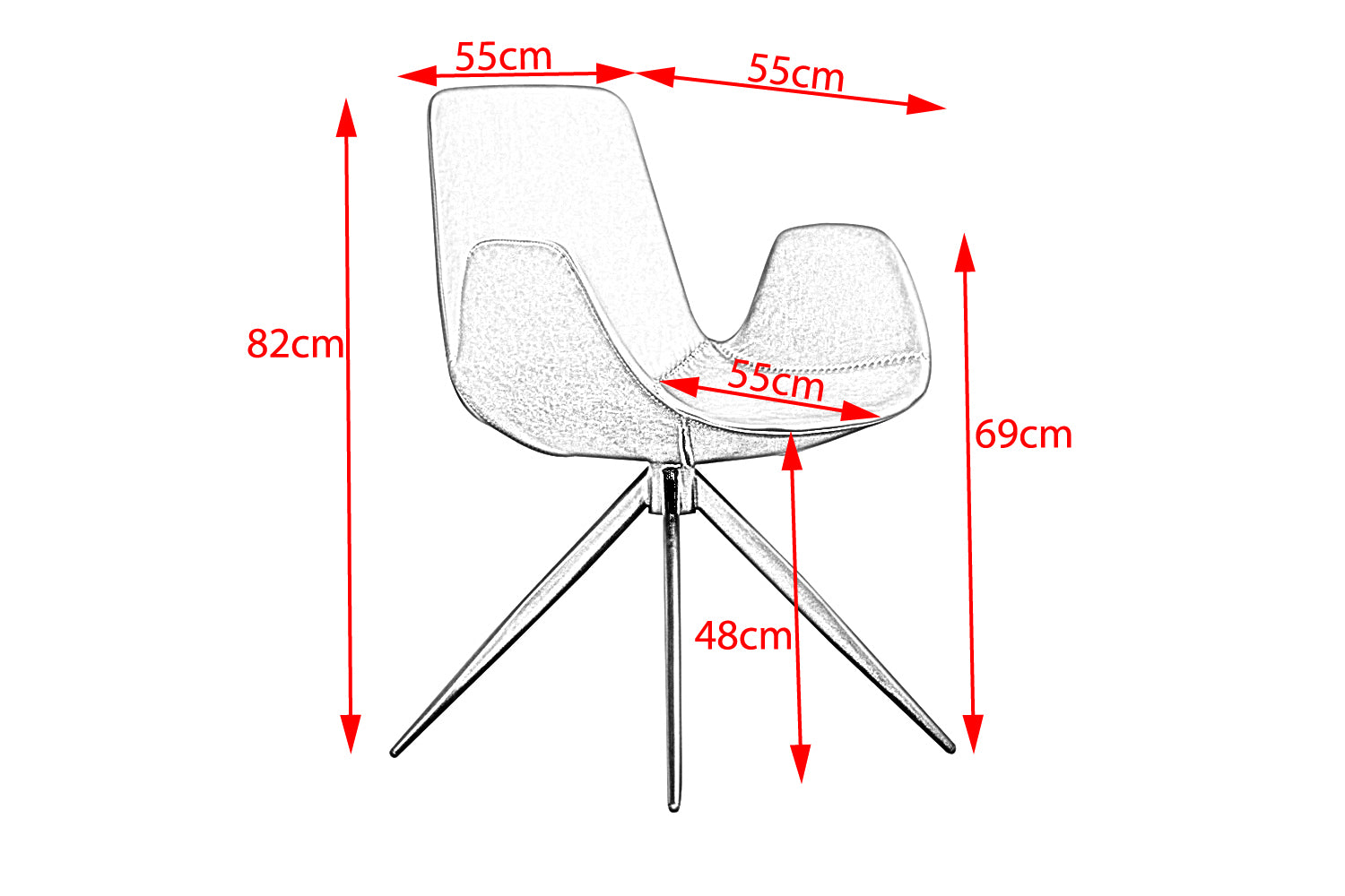 Die Sitzschale ist in einem strapazierfähigen Kunstleder bezogen, welches vor allem durch die angenehme Haptik heraussticht. Die Füße des Stuhls haben die Farbe schwarz und setzen sich somit optimal von der modern geformten Sitzschale ab.