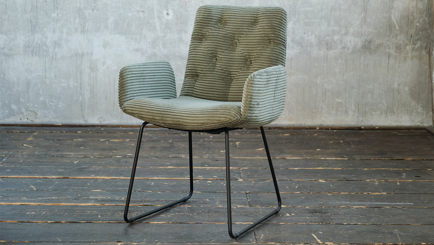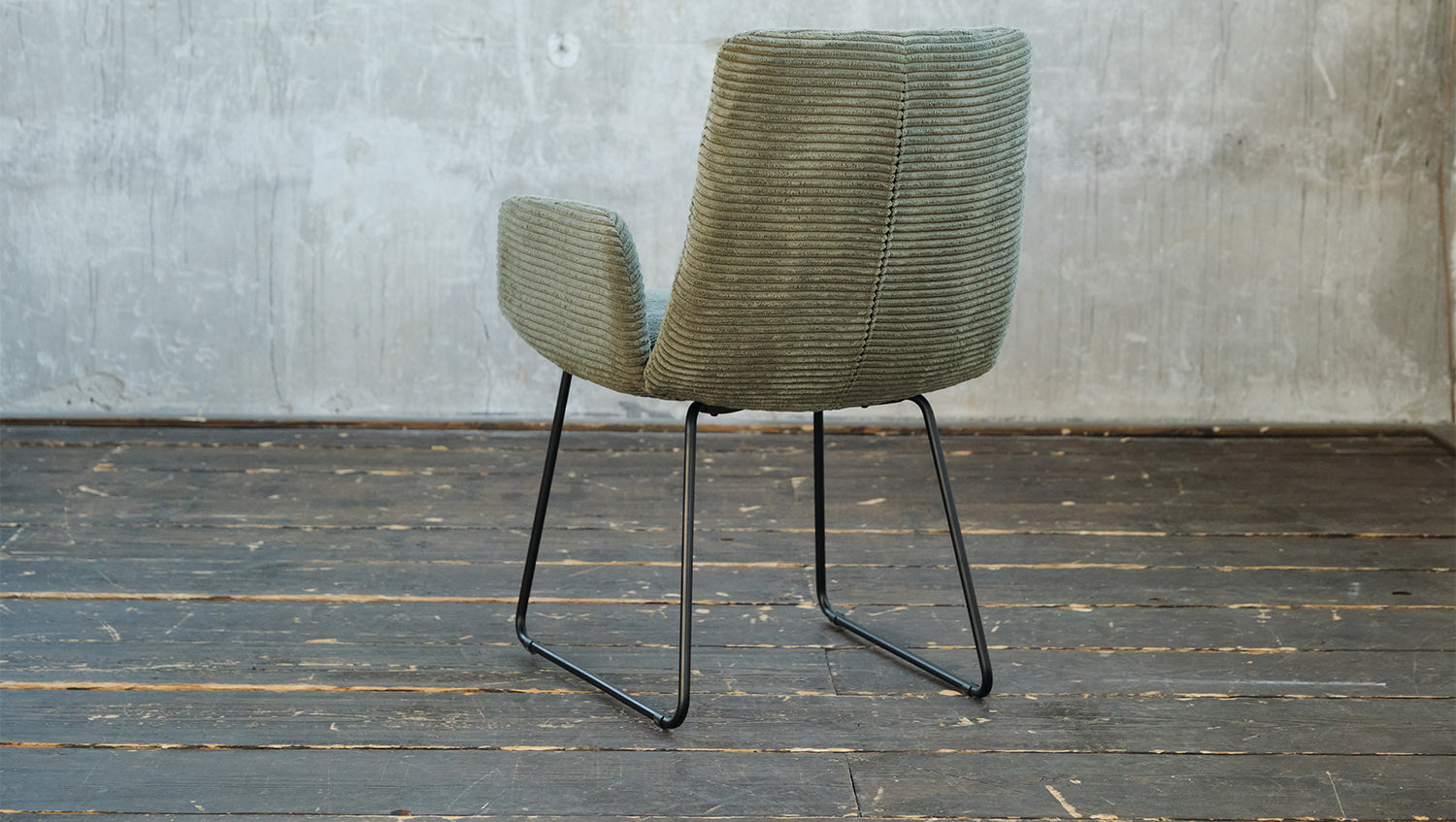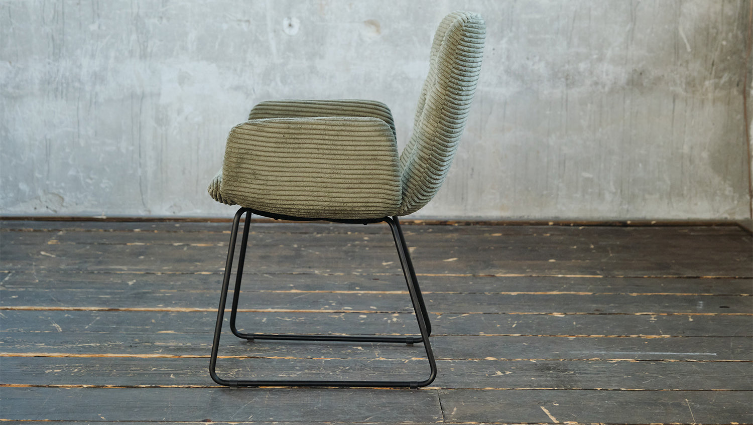 Der KAWOLA Esszimmerstuhl NEW CHARME ist nicht nur um ein Möbelstück, sondern ein wahres Design-Highlight, das in Ihrem Zuhause neue Akzente setzt. Der Stil der Serie NEW CHARME erinnert an die Sechziger Jahre: Der Rücken wurde aufwendig abgesteppt ohne Knöpfe; die Rückenlehne wurde an den beiden Seiten leicht nach vorne gewölbt und erinnert an die Form eines Ohrensessels; die Kufenfüße aus Metall sind pulverbeschichtet. Zu der ausgefallenen Form des Stuhls NEW CHARME wurde hier der Bezug in angesagtem Cord-Stoff gewählt. Wer nicht nur einen Esszimmerstuhl sucht, sondern einen zeitlos-stylischen Trendsetter, liegt mit der Serie NEW CHARME von KAWOLA goldrichtig!