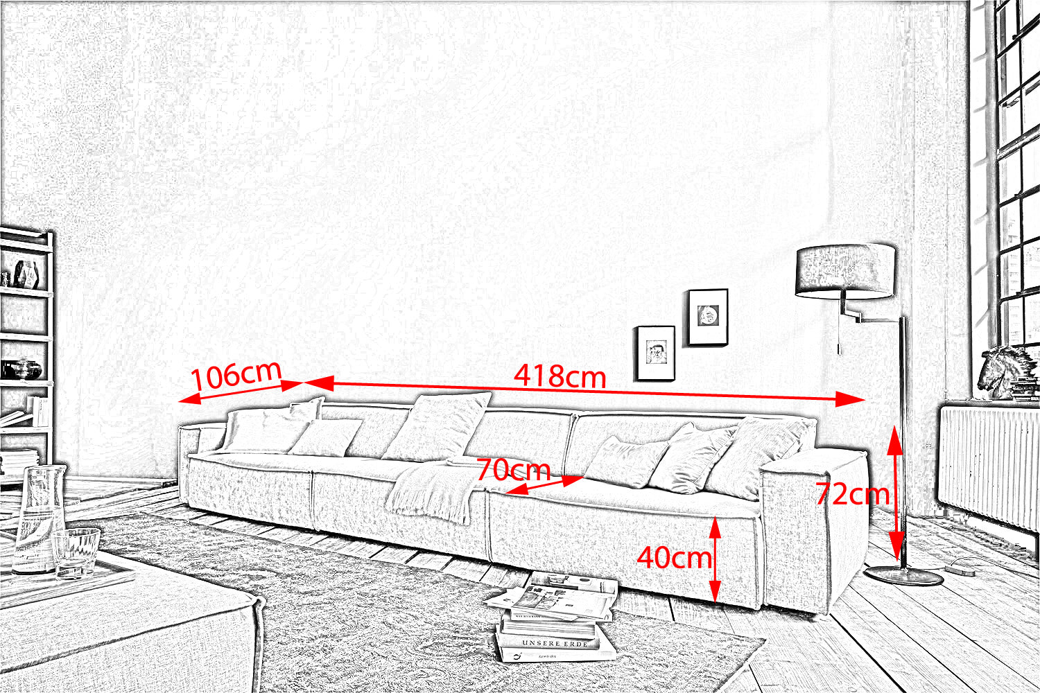 Das KAWOLA Riesensofa SAMU besticht durch seinen hervorragenden Sitzkomfort, der durch den äußerst weichen und legeren Polsteraufbau zustande kommt und zum Verweilen und Entspannen einlädt. Die Polsterung passt sich der Körperform an; Sitzabdrücke sowie Wellenbildung der Bezüge sind warentypisch. Die ungewöhnliche Breite des "4,5-Sitzers" verleiht dem Sofa sein unverwechselbares Aussehen und bietet ausreichend Platz, um mit Freunden und Familie gemütliche Abende zu verbringen. Mit seinem zeitlosen Design fügt es sich nahtlos in jede Umgebung ein und macht auch frei im Raum stehend eine gute Figur. Wenn Sie Ihrem Wohnzimmer einen außergewöhnlichen Anstrich verleihen wollen, ist das Sofa SAMU definitiv das Richtige für Sie!