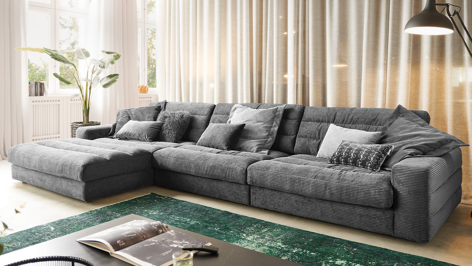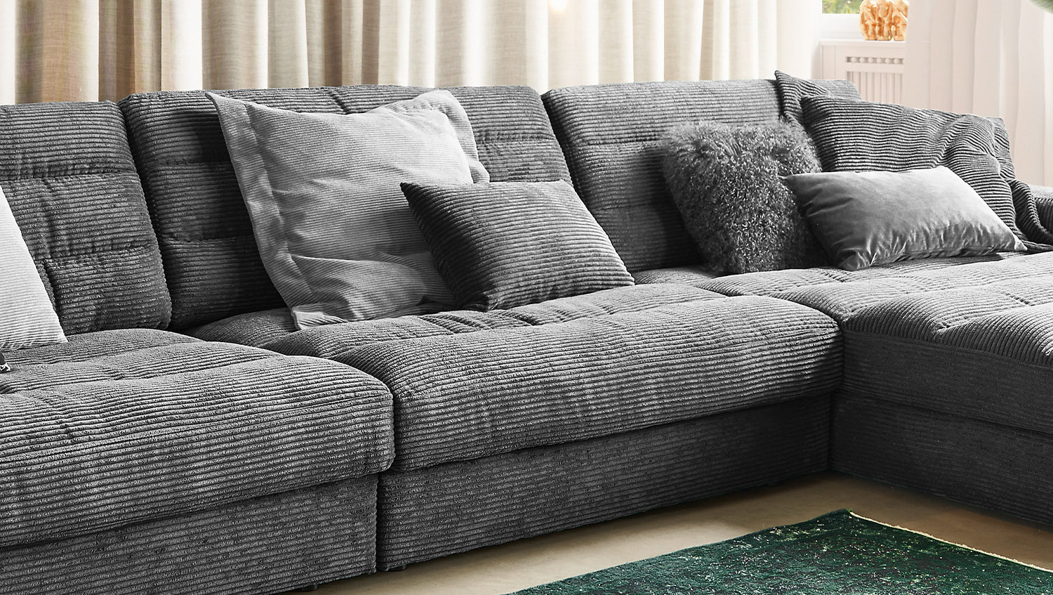 Das KAWOLA Ecksofa LANA begeistert mit Stil und Eleganz. Das klassische Design und der Bezug aus trendigem Cord-Stoff verleihen ihm eine zeitlose Schönheit, die Ihrem Wohnzimmer eine einzigartige Wohlfühl-Atmosphäre verleiht. Die Polsterung garantiert höchsten Sitzkomfort und passt sich der Körperform an. Sitzabdrücke sowie Wellenbildung der Bezüge sind warentypisch. Der Sitz besteht aus einer Unterfederung mit dauerelastischen Stahl-Wellenfedern und einer oberseitigen Abdeckung sowie lose Sitzkissen aus PUR-Schaum. Sitz und Rücken sind abgedeckt mit einem Inlett, welches befüllt ist mit hochwertigen Füllstoffen, die eine Beimischung von Federn enthalten. Um ein Stauchen des Füllmaterials zu verhindern, sollten die Sitz- und Rückenkissen nach Gebrauch aufgeschüttelt werden. Entspannen Sie auf dem KAWOLA Sofa LANA, und lassen Sie sich aus dem grauen Alltag entführen...