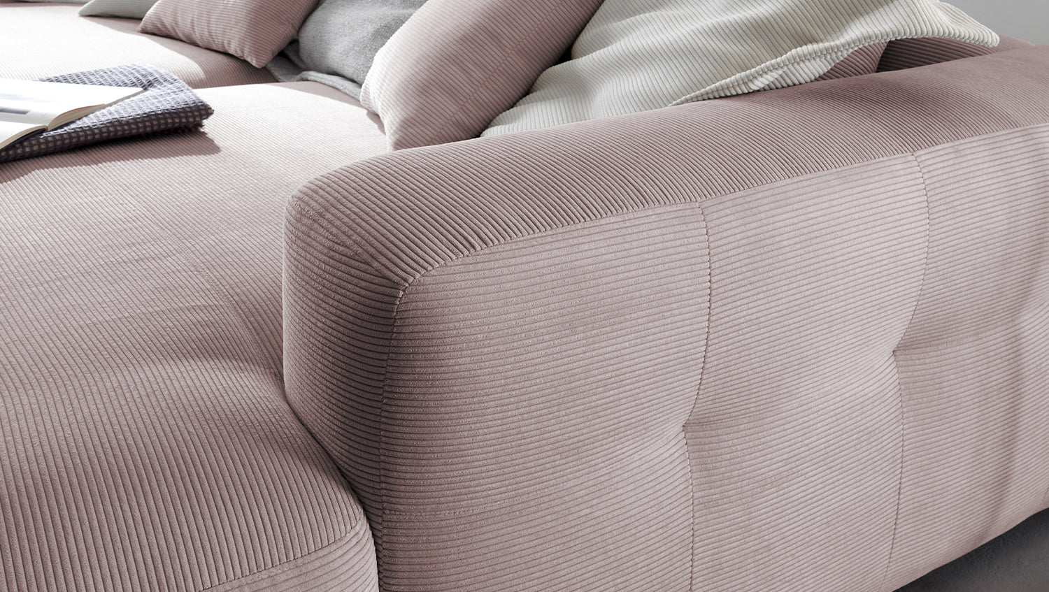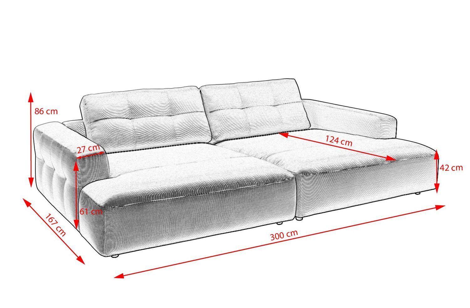 Das herausragende Merkmal ist der mittelfeste Sitzkomfort, der eine angenehme Balance zwischen Unterstützung und Gemütlichkeit bietet. Mit Abmessungen von 300 cm Breite und 167 cm Tiefe bietet das Sofa ausreichend Platz für entspannte Stunden.