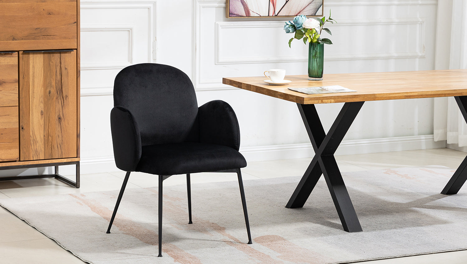Neben seinem ansprechenden Design bietet der DEON Esszimmerstuhl herausragenden Sitzkomfort. Die geschwungenen Linien und gepolsterten Armlehnen unterstützen Ihre Körperhaltung, laden zu längeren Mahlzeiten und angeregten Gesprächen ein. Die pulverbeschichteten schwarzen Stahlbeine gewährleisten Stabilität und verleihen dem Stuhl eine moderne Ästhetik.