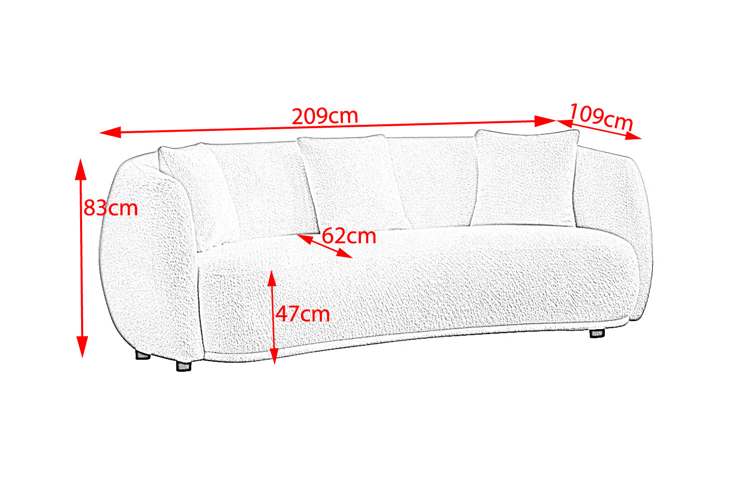 Das Sofa bietet mit einer Breite von 209 cm ausreichend Platz für gesellige Stunden. Der super softe Sitzkomfort lädt dazu ein, sich fallen zu lassen und pure Entspannung zu genießen. Die großzügige Sitztiefe von 62 cm sorgt für zusätzlichen Komfort.