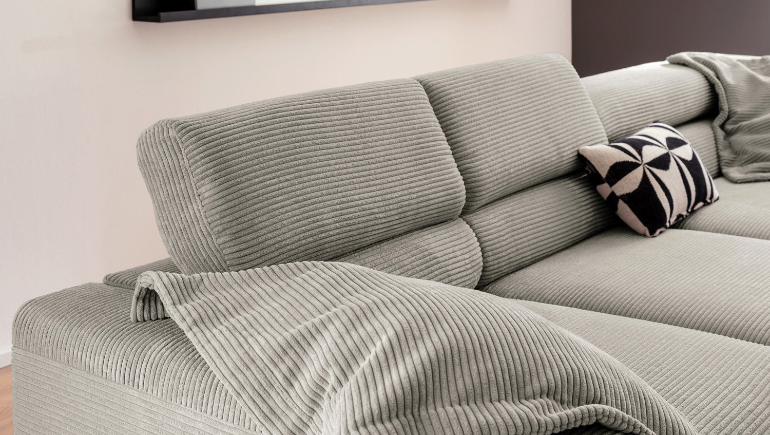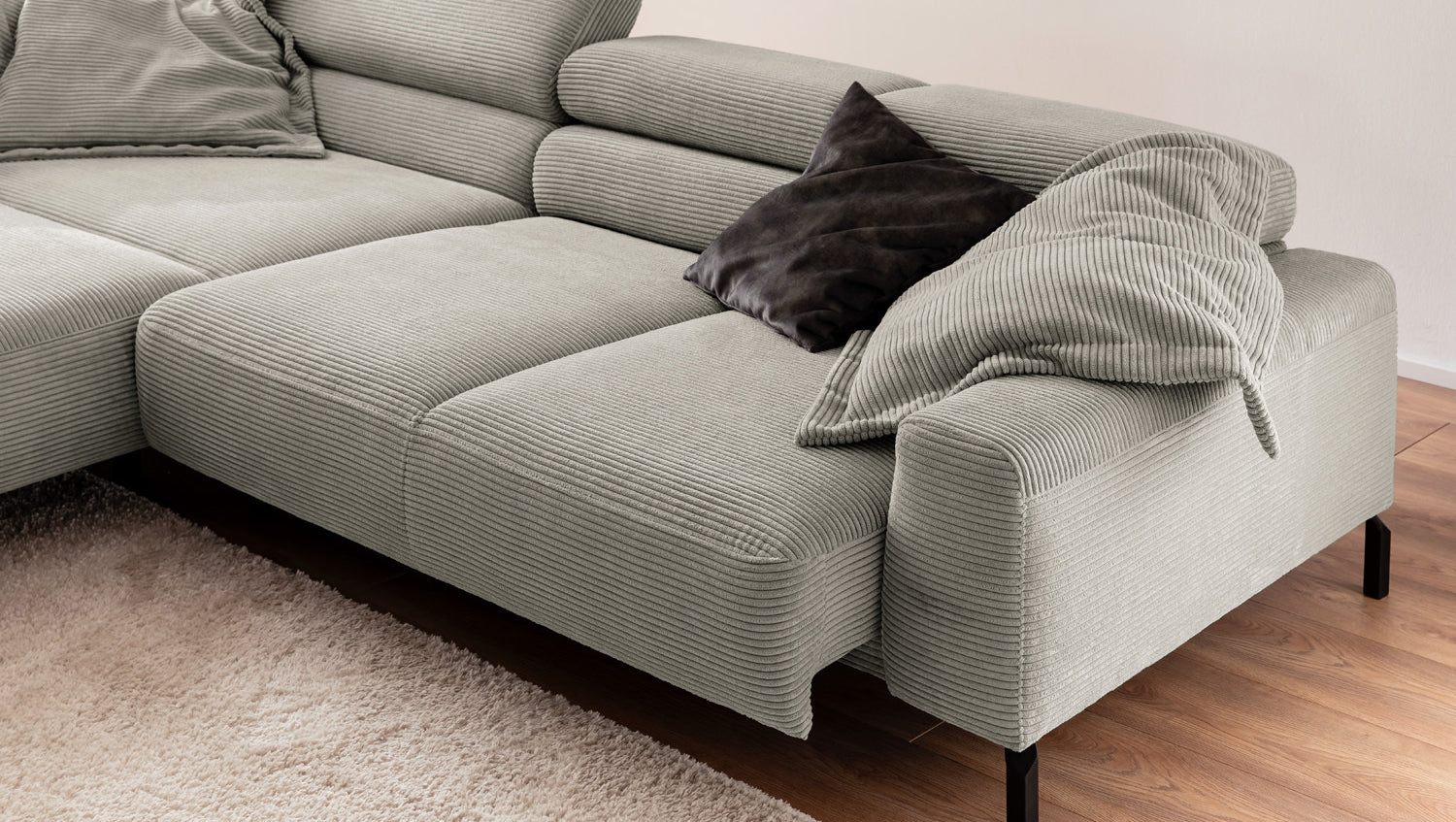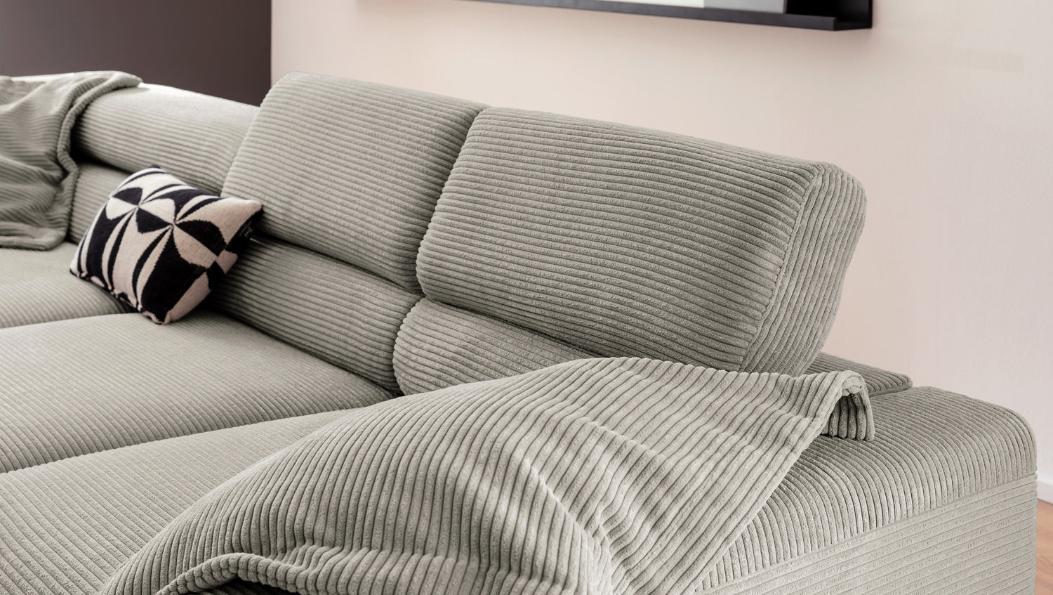 Ein Highlight ist die innovative Kopfteilverstellung, mit der Sie die Kopfteile individuell neigen oder aufrecht stellen können. Perfekt für entspannte Abende beim Lesen oder Filme schauen. Das Ecksofa DELIA vereint Funktionalität und Stil auf höchstem Niveau.