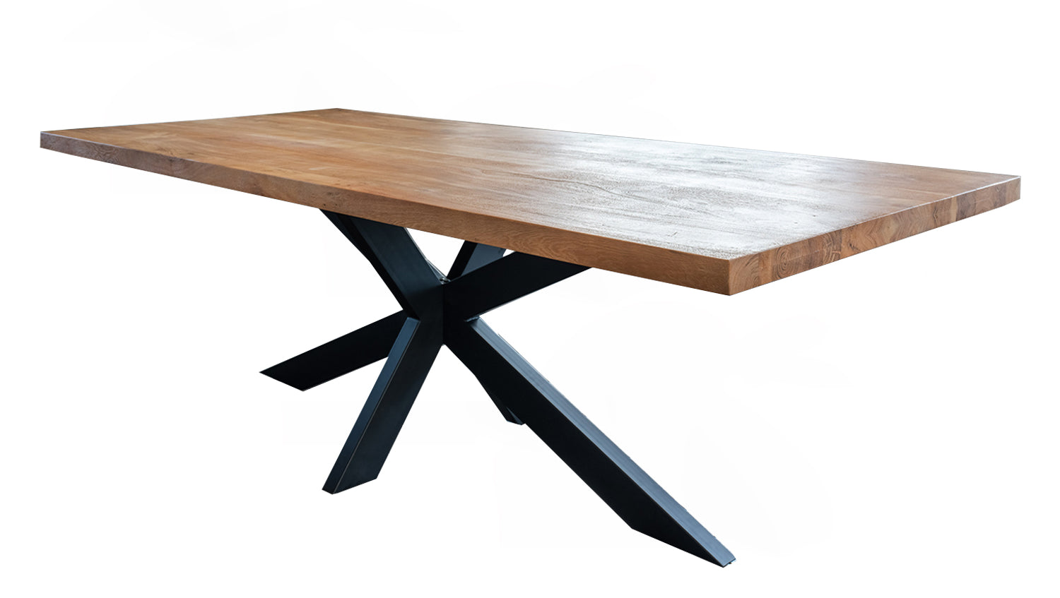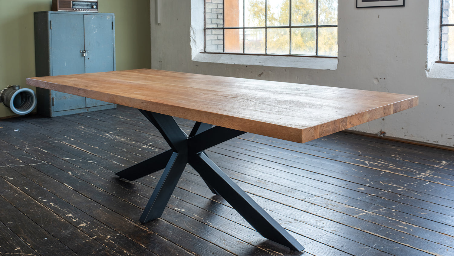 Das rustikal geschweißte Untergestell im Industriedesign, schwarz lackiert und mit einem markanten Spider-Fuß, verleiht dem Tisch eine moderne, industrielle Note. Diese gelungene Kombination aus natürlichem Holz und robustem Metall macht den Tisch zu einem Design-Highlight in Ihrem Esszimmer.