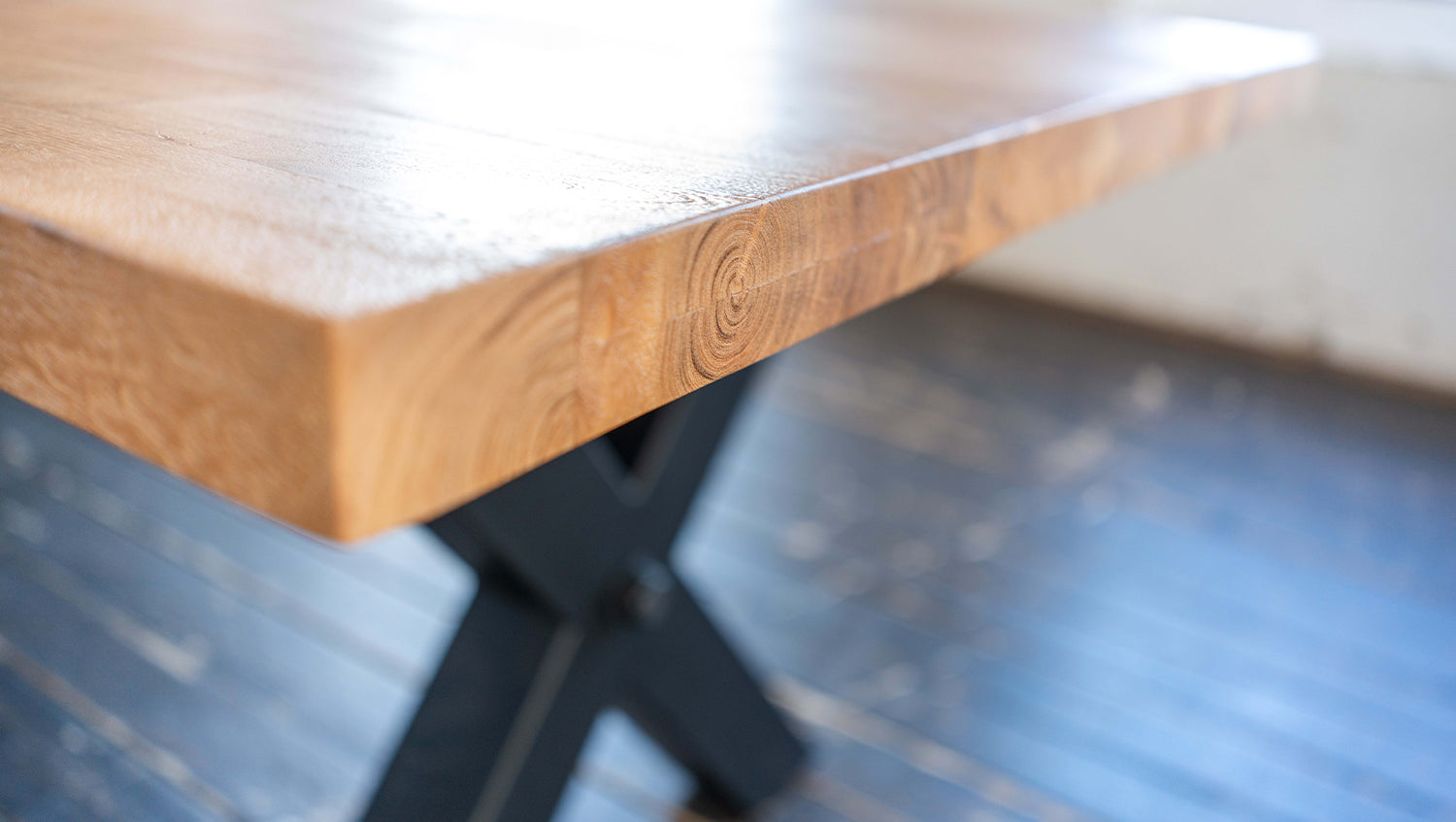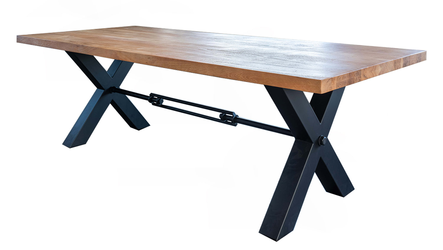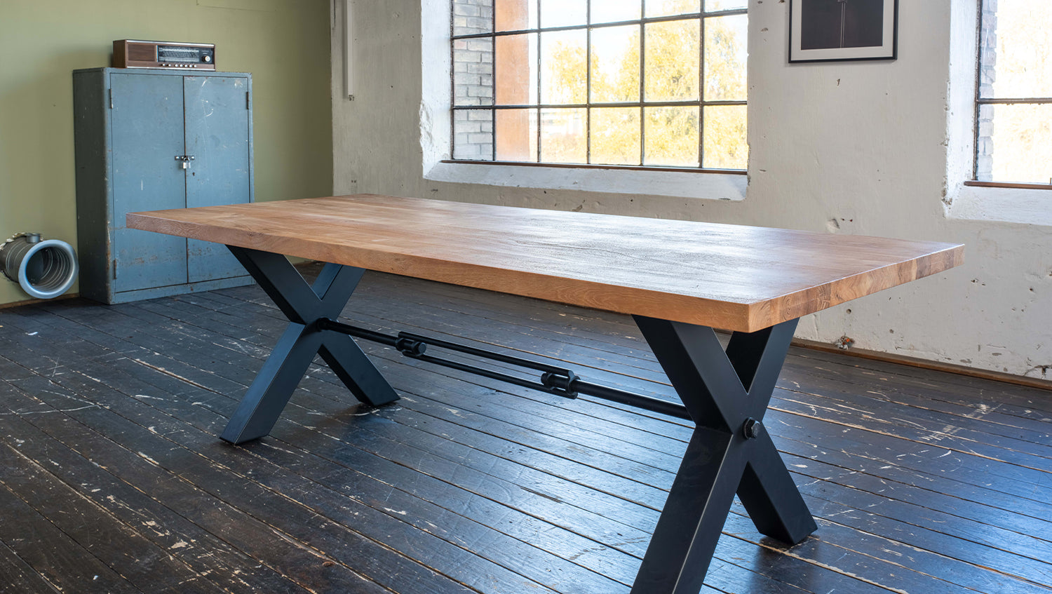 Das rustikal geschweißte Untergestell im Industriedesign, schwarz lackiert und mit zwei markanten X-Füßen, verleiht dem Tisch eine moderne, industrielle Note. Diese gelungene Kombination aus natürlichem Holz und robustem Metall macht den Tisch zu einem Design-Highlight in Ihrem Esszimmer.