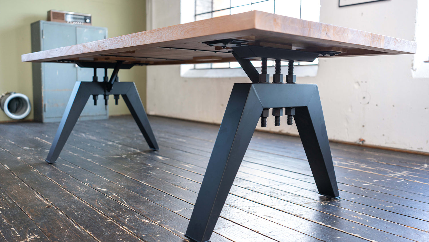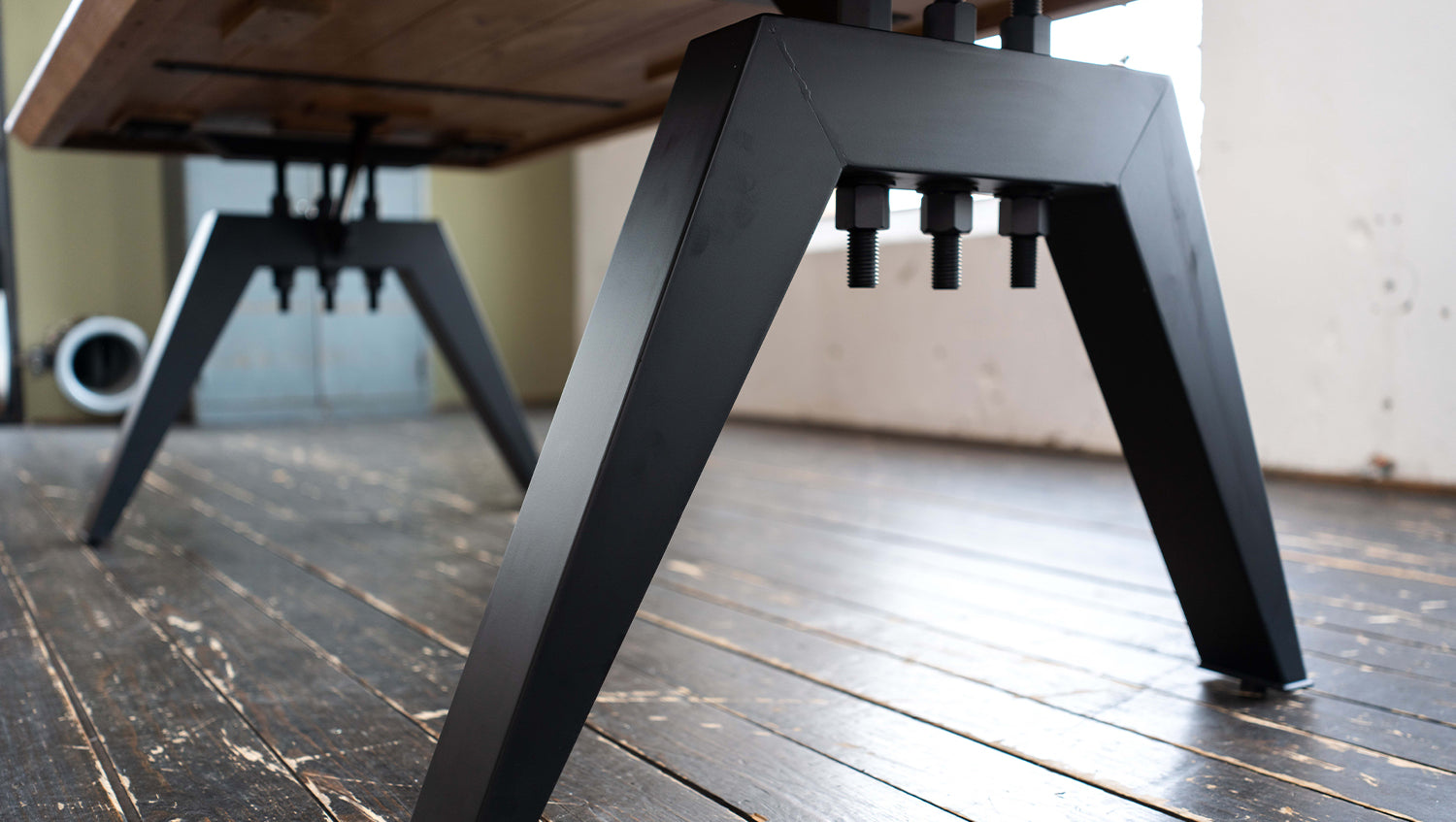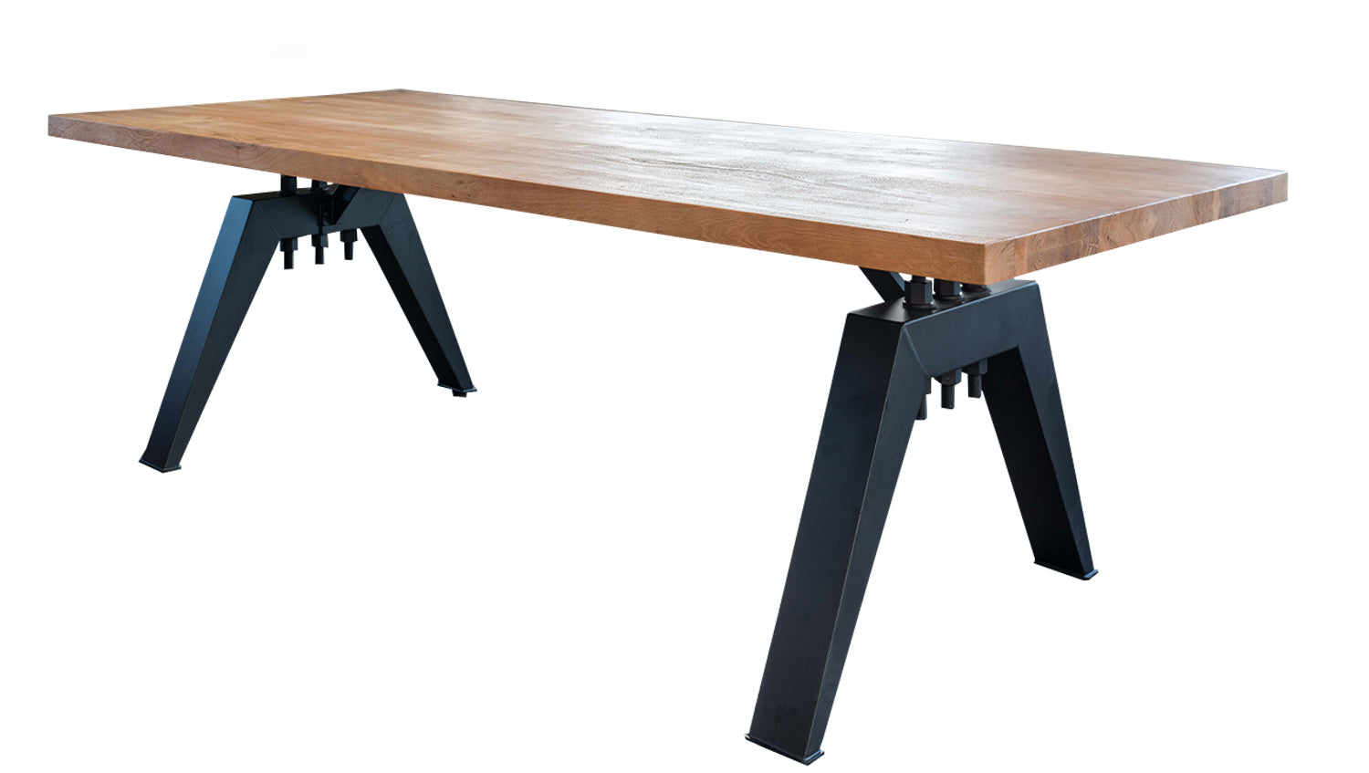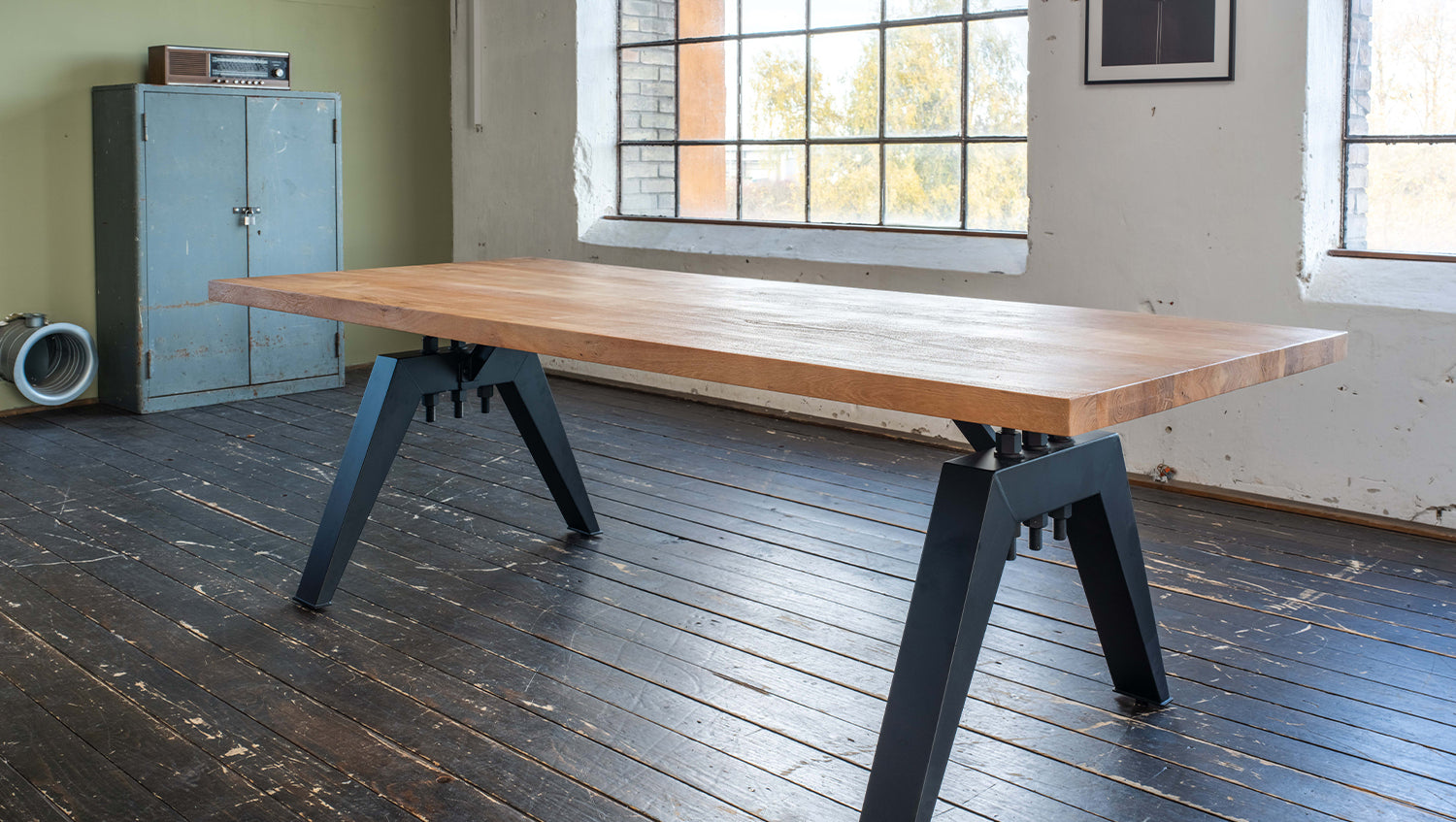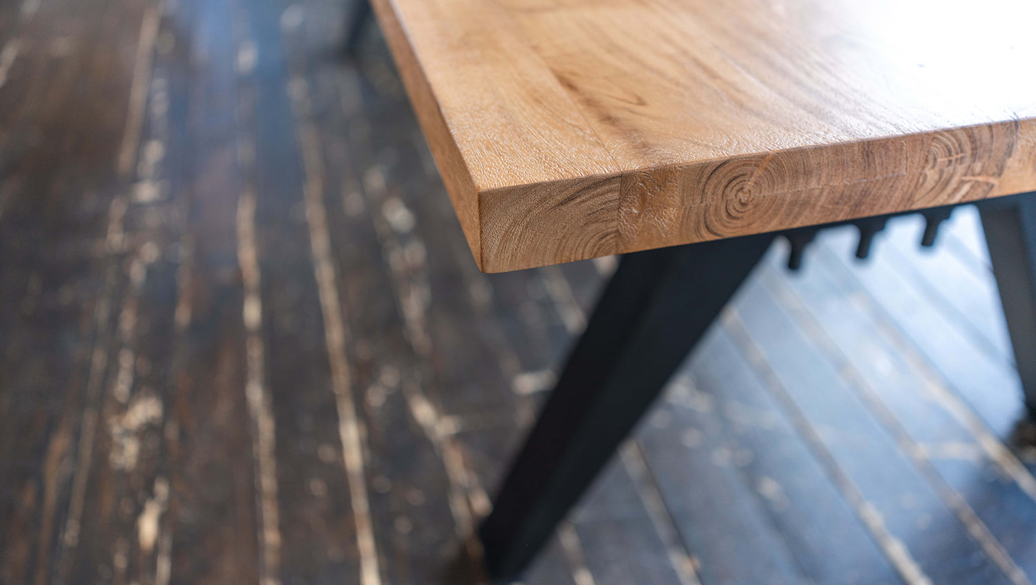 Das rustikal geschweißte, schwarz lackierte Untergestell im Industriedesign verleiht dem Tisch eine moderne, industrielle Note. Diese gelungene Kombination aus natürlichem Holz und robustem Metall macht den Tisch zu einem Design-Highlight in Ihrem Esszimmer.