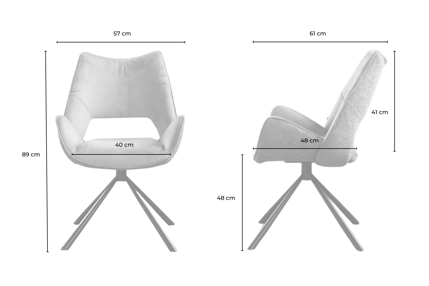 Bei diesem Stuhl handelt es sich um B-Ware aus einer Kundenrücksendung, die gewisse kleinere Mängel aufweist und daher von uns zu einem reduzierten Preis angeboten werden. Mögliche Mängel sind: Kratzer am Gestell, Druckstellen, leichte Verunreinigungen und Farbabweichungen auf der Polsterung sowie Risse im Unterbodenstoff. Bitte schauen Sie sich hierzu die Mängelbilder direkt nach der Skizze an. Diese dienen lediglich der Veranschaulichung möglicher Mängel. Es handelt sich um allgemeine Beispielbilder, die nicht den vorliegenden Artikel darstellen. Der Artikel weist nicht zwangsläufig sämtliche aufgeführten Mängel auf. Auch die auf den Mängelbildern zu sehenden Bezugsstoffe und Farben beziehen sich nicht auf diesen Artikel. Der KAWOLA Esszimmerstuhl VELO kombiniert modernes Design mit höchstem Komfort. Mit einer Breite von 57 cm, einer Tiefe von 61 cm und einer Höhe von 89 cm bietet dieser Drehstuhl ausreichend Platz und Bequemlichkeit für lange Dinnerabende. Die Sitzhöhe von 48 cm, die Sitztiefe von 48 cm und die Sitzbreite von 40 cm sorgen für eine optimale Sitzposition. Der VELO Esszimmerstuhl überzeugt durch sein pulverbeschichtetes, schwarzes Metall-Drehgestell, das nicht nur robust, sondern auch stilvoll ist. Die ergonomisch geformte Sitzfläche gewährleistet hohen Sitzkomfort, sodass Sie und Ihre Gäste sich rundum wohlfühlen können. Perfekt für jedes moderne Esszimmer, fügt sich der Drehstuhl harmonisch in unterschiedliche Einrichtungsstile ein. Entscheiden Sie sich für den KAWOLA Esszimmerstuhl VELO und genießen Sie Design und Funktionalität auf höchstem Niveau.